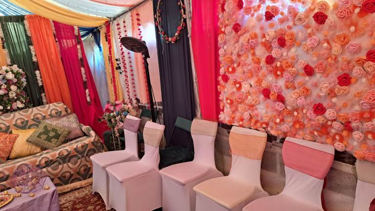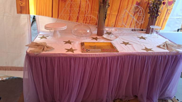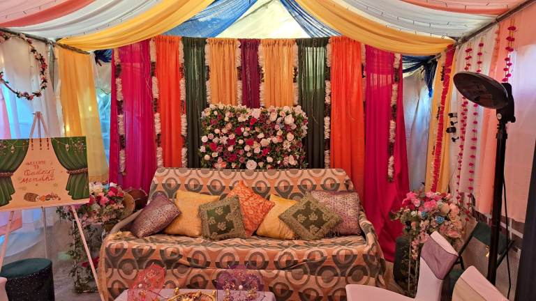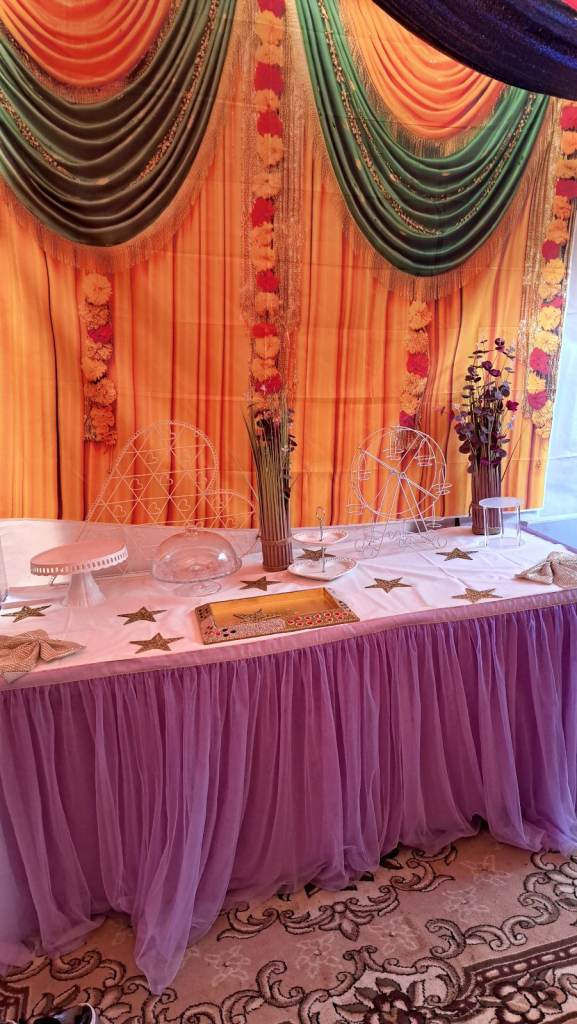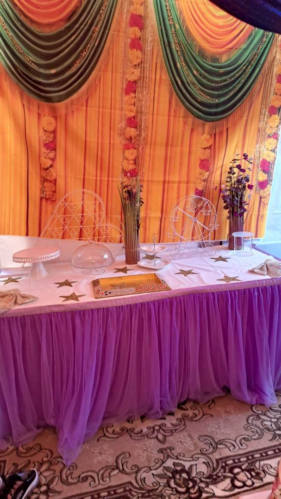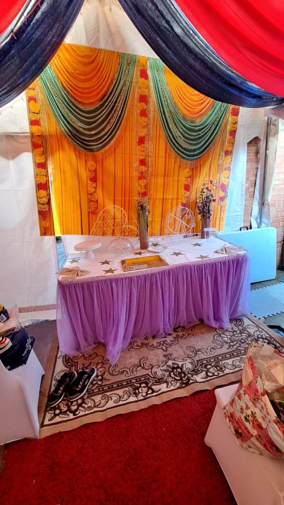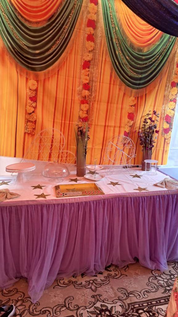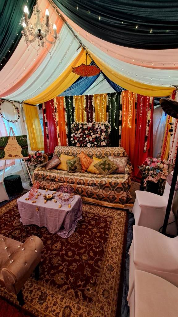 Mehndi Display. This includes backdrop, with lights, flower wall, seating for stage, flowers either side stage. Table with decorations. Speaker, mehndhi table, lights and fabrics with extra lights covering all marque and ceiling.
