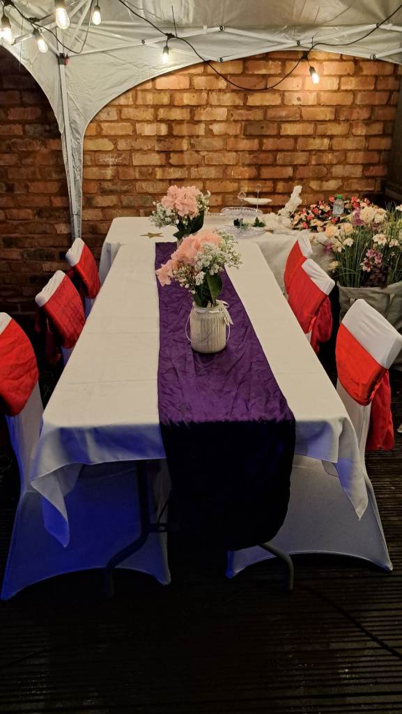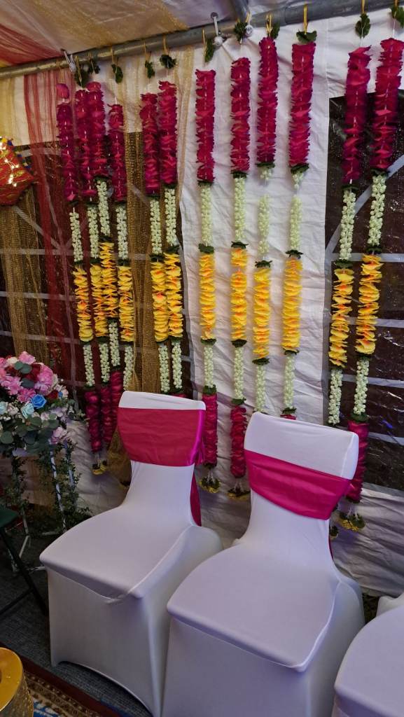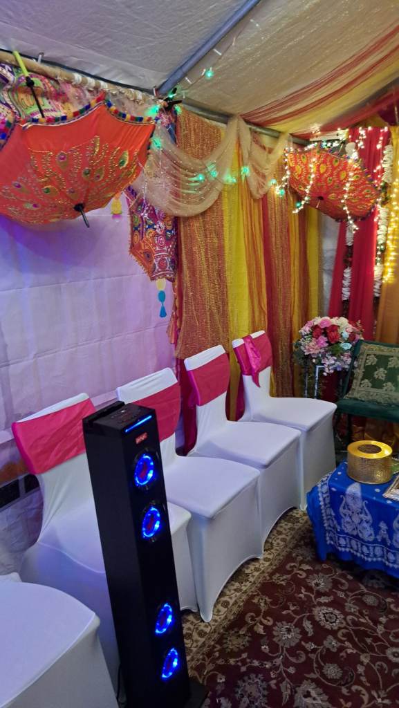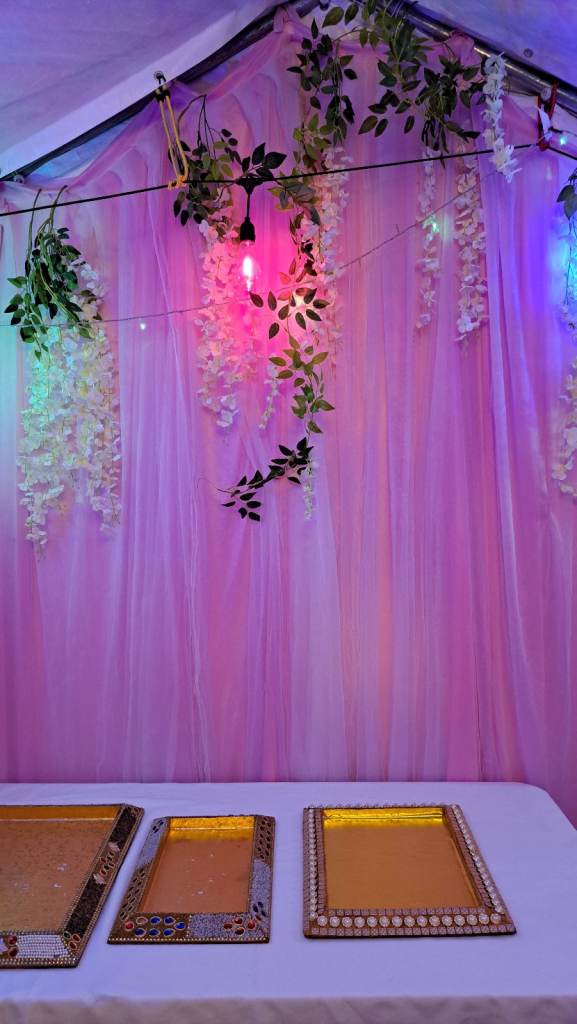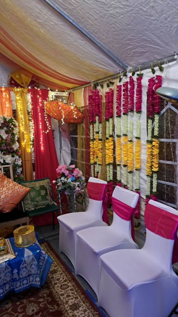 For 2 days if in 3 by 6 marque or home. In a small community hall just 1 day. You will have backdrop with lights, umbrellas, flowers and speaker. If require for more days that can be arranged.