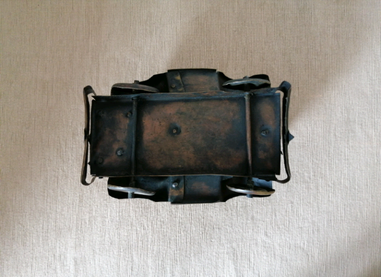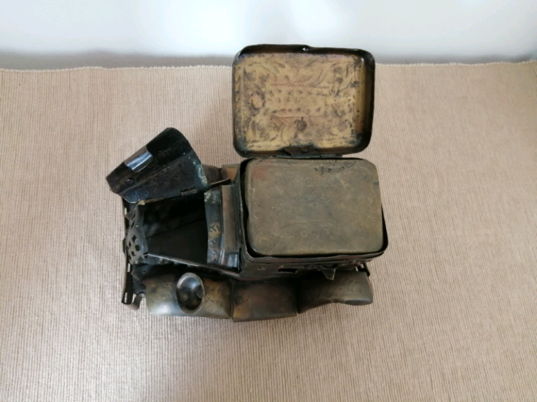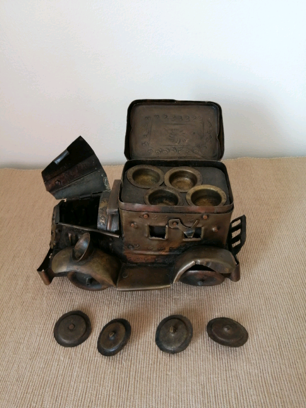 the roof opens & in it is enclosed a box containing 4 small lidded dishes &