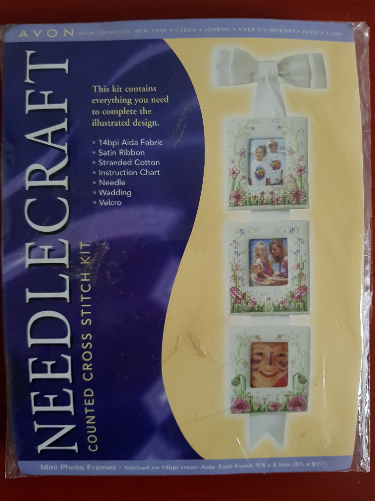 Avon Needlecraft counted cross stitch kit. Makes three mini photo frames wiith pretty floral designs (each frame 9.5cm x 8.5cm). Includes 14bpi Aida fabric, cotton threads, needle, wadding, velcro, satin ribbon to mount the frames on, and full instructions. Unused and all contents complete. As well as free collection from us, we also offer UK postal delivery for £3.25.