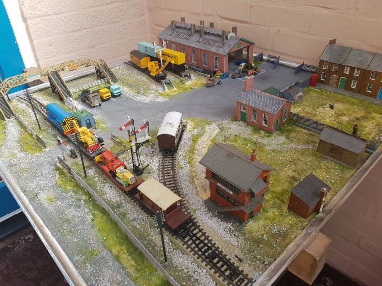 Made by family member years ago, collectors item not a children's toy, everything in photo's is included trains do not run, static display only.. 1m x 1m square collection only.. signs of wear its old...