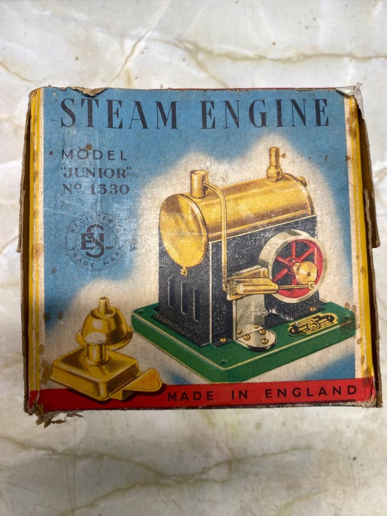 ESL “Junior” Model 1530 steam engine. Complete with burner, filling funnel and instructions. Box is a bit tatty.
