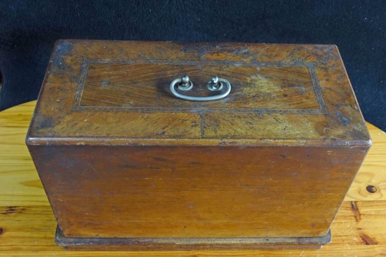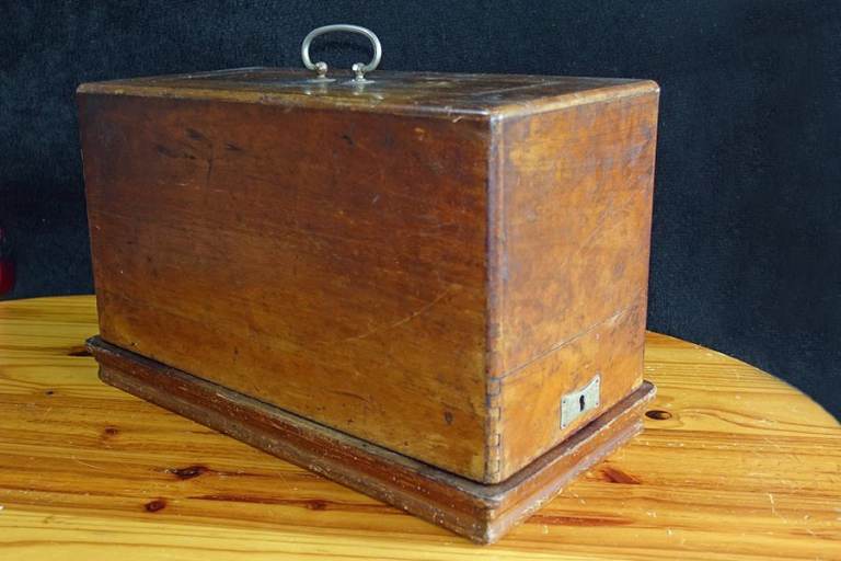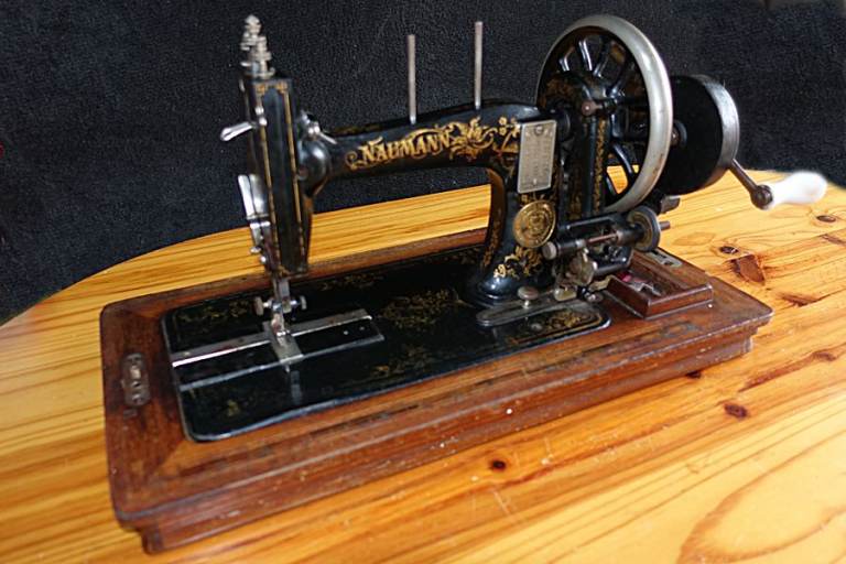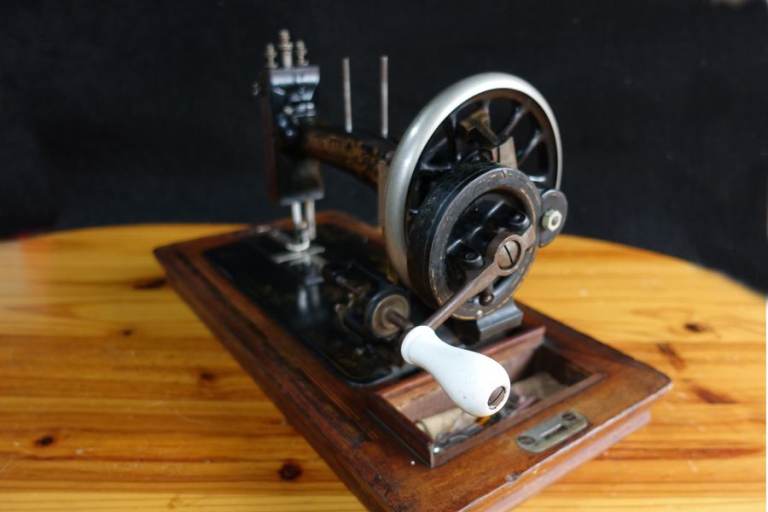 1900's sewing machine in wooden case with key. Turned by hand using a ceramic handle that folds to allow the machine to fit into the case.
