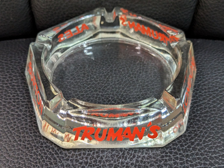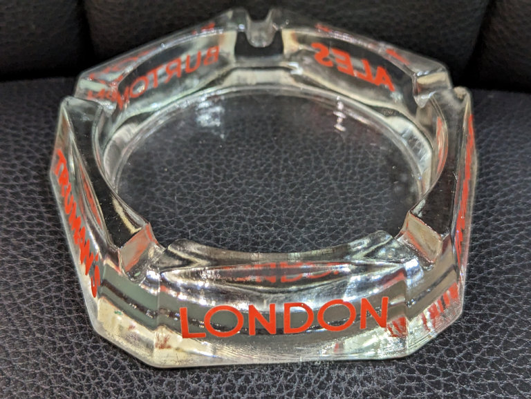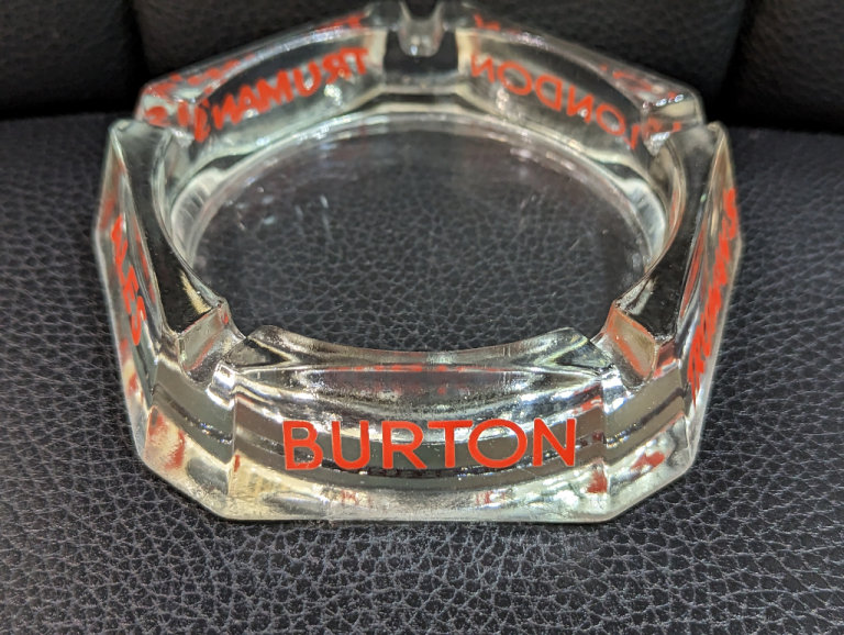 This is an original vintage Truman's Ales Burton London glass ashtray with 5 sides.
