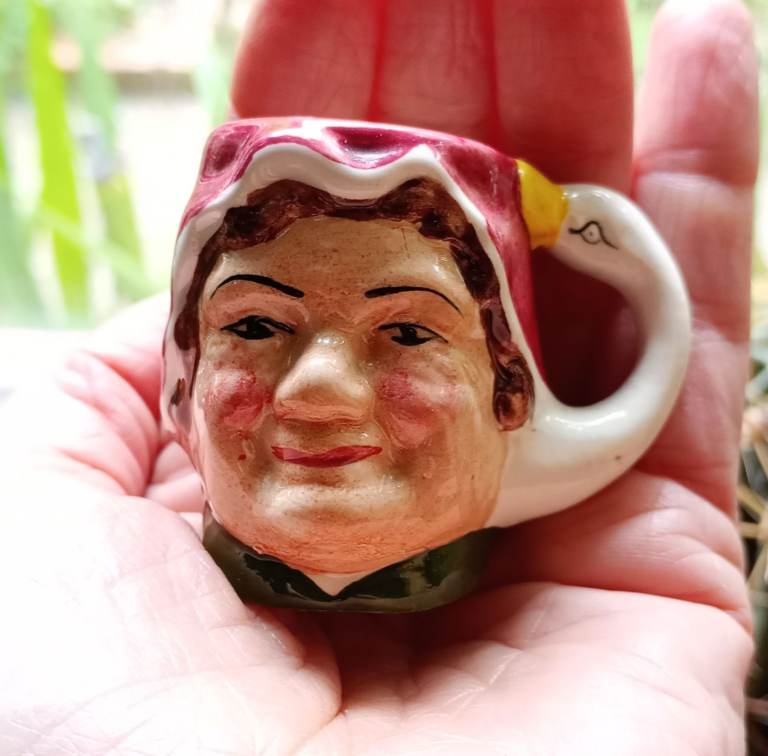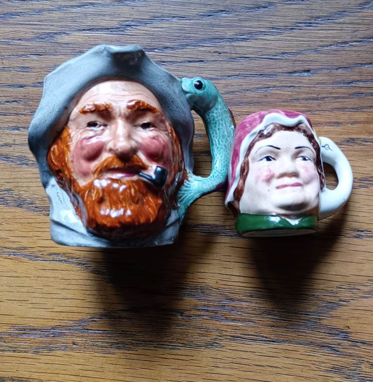Both character jugs are in a good condition with no chips or cracks. Measurements Skipper - 7 cm to highest point x 9 cm to the widest point. mother goose / farmers wife - 4.5 cmx 5.5 cm