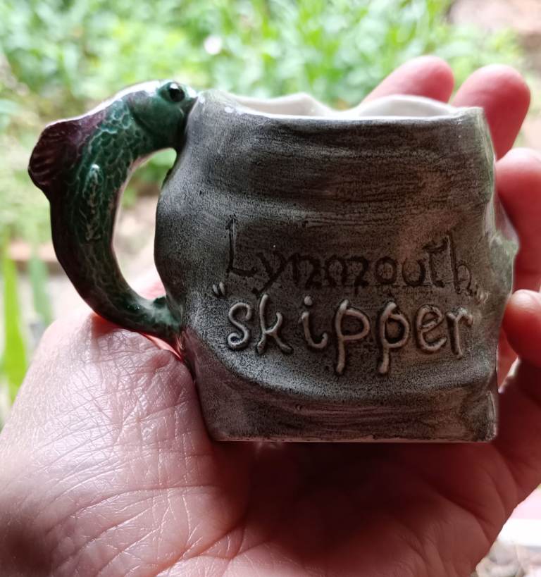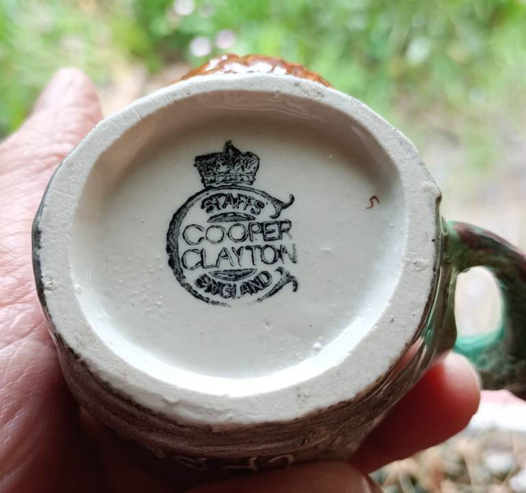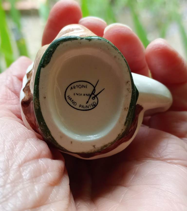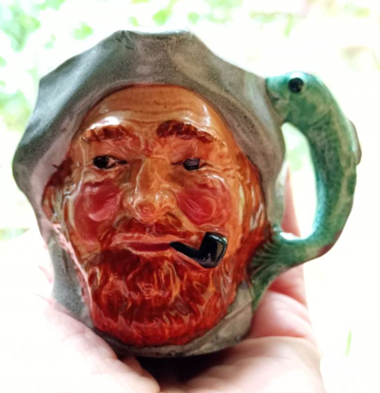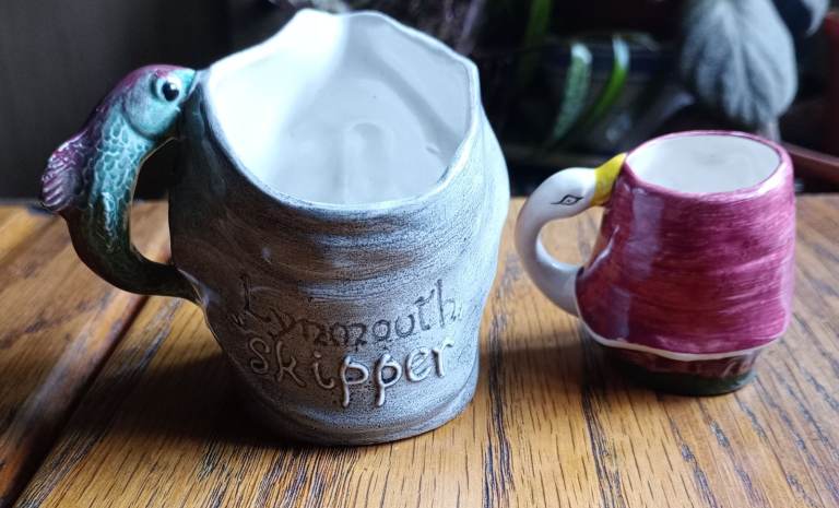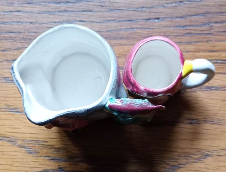 This is a pair of small character jugs, decorated with vibrant, multicoloured designs, these jugs feature the delightful Staffordshire Cooper Clayton 'Skipper' with a fish handle from Lynmouth and Artone 'Mother Goose / Farmers wife' with a goose head handle, bringing a touch of whimsy to any setting. The makers mark on the bottom of the cooper clayton jug shows it was made before the factory closed around 1950. I have not seen many of the Skipper mugs for sale with the little fish handle and I haven't seen one that also has Lynmouth on the back ( so far )
