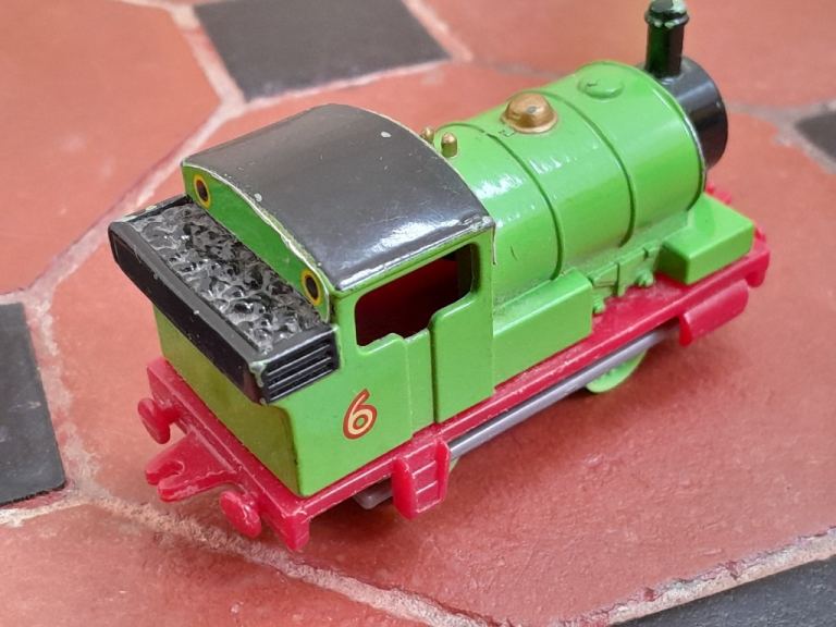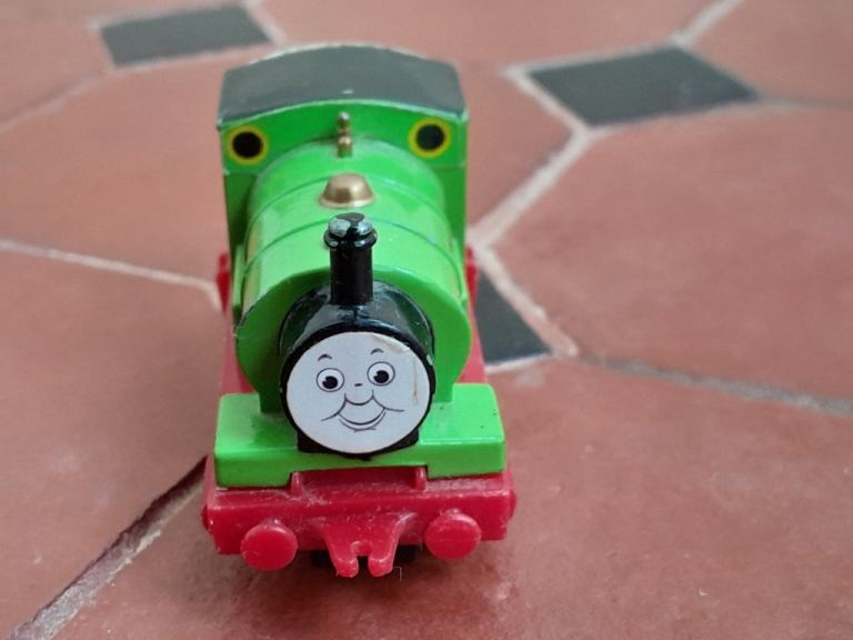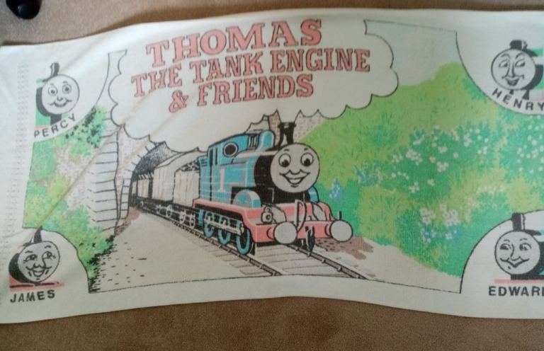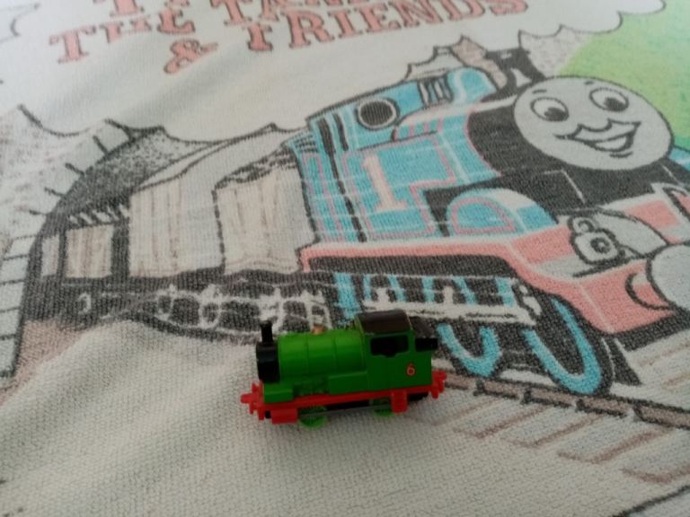 Die-cast Percy engine from the 1980s and a Thomas the Tank Engine bath towel also from the 1980s.