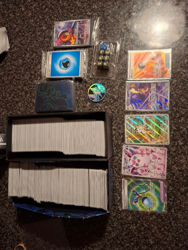 Pokemon cards bundle phantasmal flames common, uncommon, ex, holos, reverse holos 4 illustrations rares, 2 ultra rares promo card, sleves and dice and coin. From a pet and smoke free home