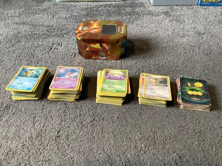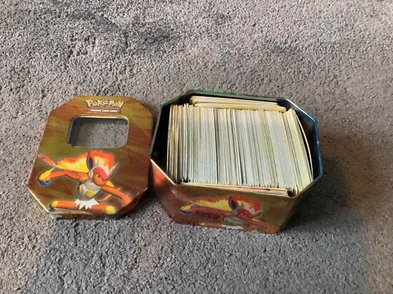 A mixture of old Pokemon Cards in tin