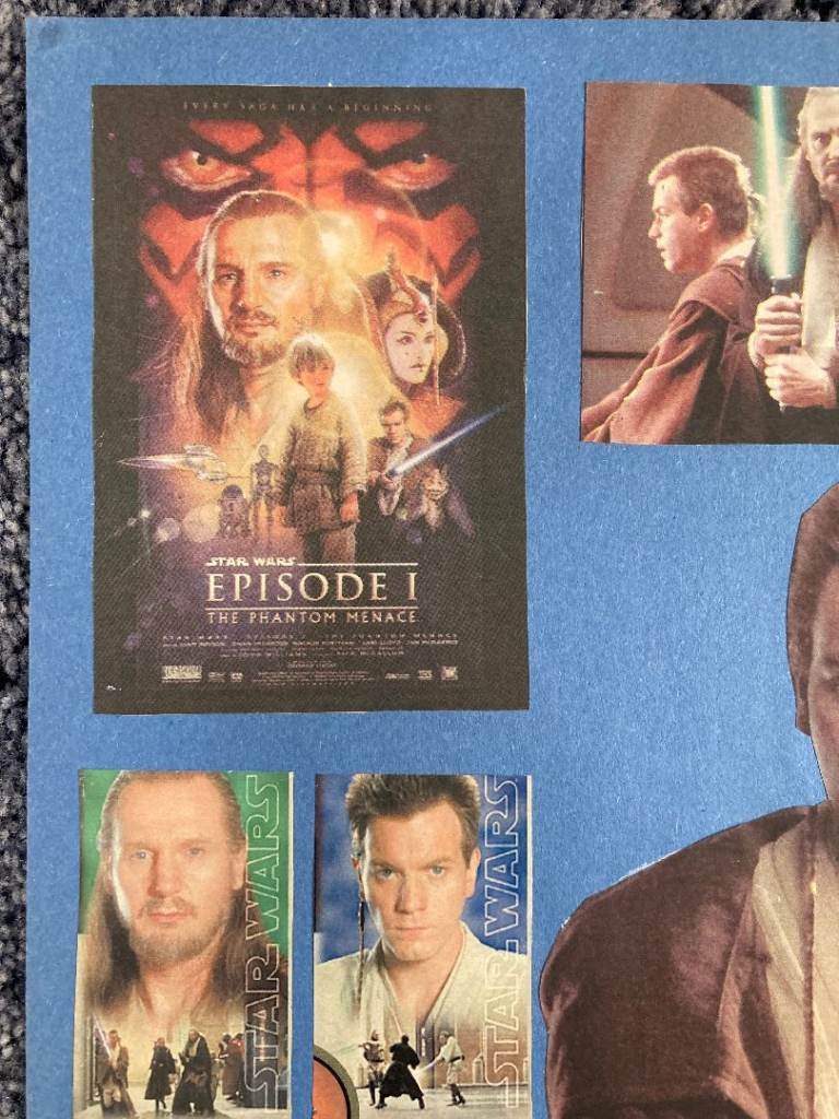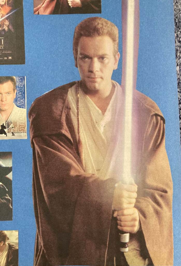 Seven Images of Jedi newspaper cut-outs mounted on blue paper card