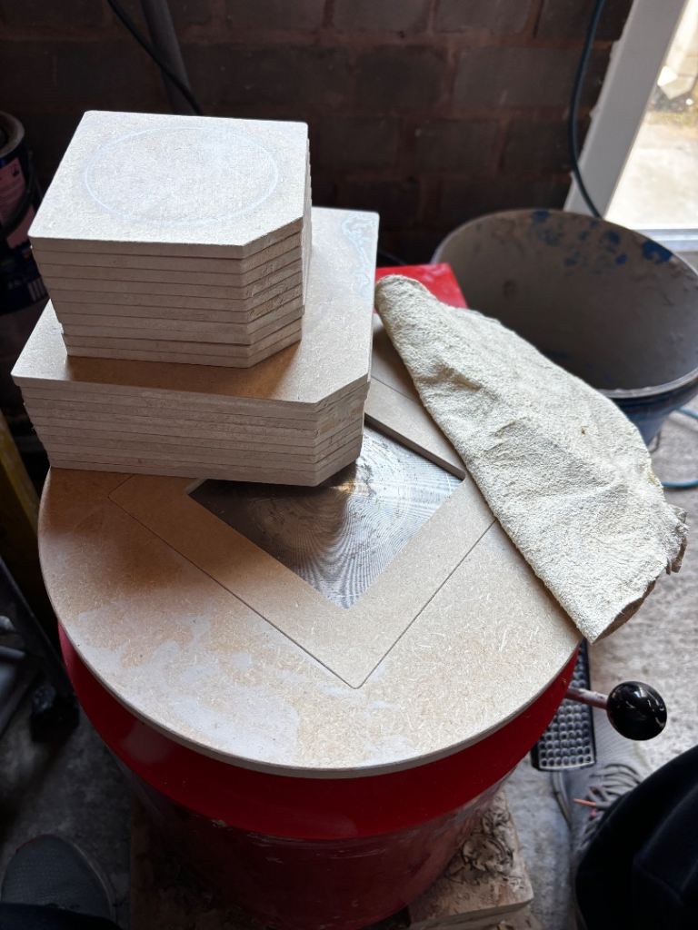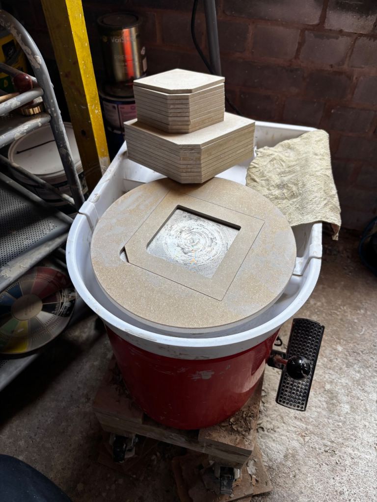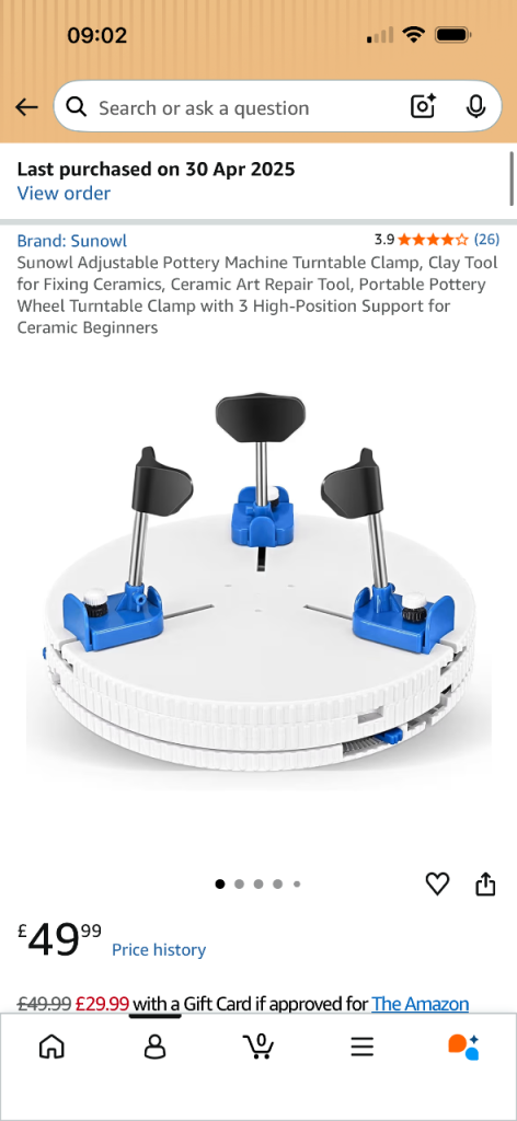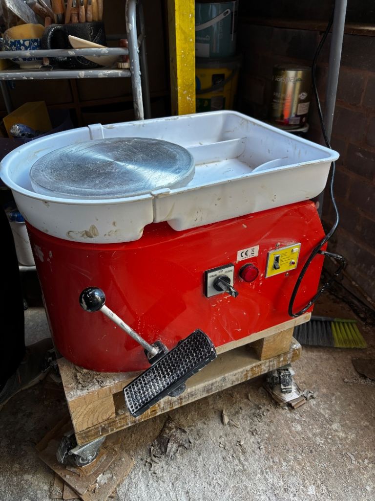 This is a wheel I brought off of Amazon. It’s done me very well. I’ve brought a custom Hartley & Noble batt system. So it’ll come with that. Along with a ‘stay-put batt rug’. It’ll also come with a trimming turn table that fits onto the pottery wheel head and allows you to trim without having to centre your piece. Screen shot of it as it’s in my garage.