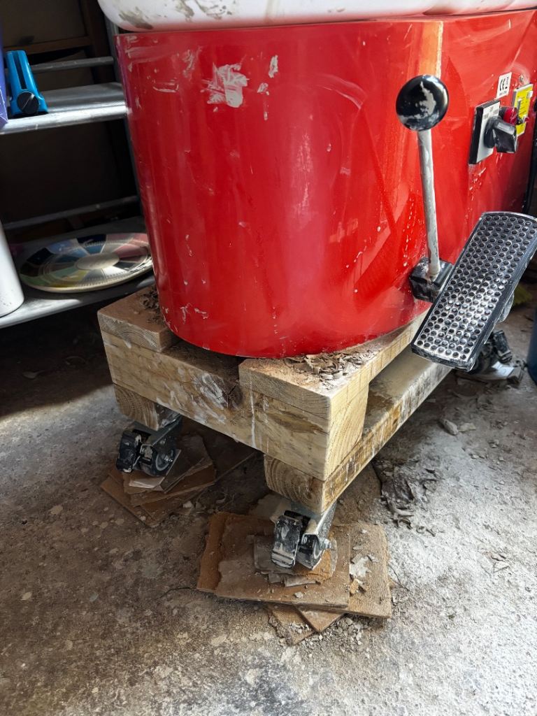 The wheel head is slightly smaller than the standard. It’s roughly 25cm. But still plenty big enough! The wheel is generally very “short”. I built myself a wooden frame to raise the height of it. And added heavy duty castors to make moving it easy. These can very easily be removed. So if you want that, let me know and I’ll remove it all when I clean it down.