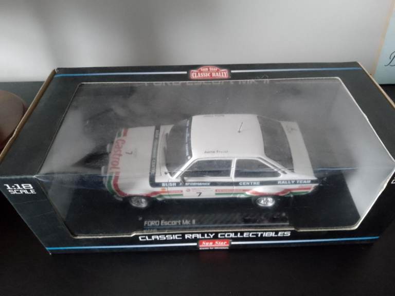 1:18 scale Ford Escort RS1800 diecast rally model; this model was converted from the Sun Star base to the car driven by the late Bertie Fisher; it is in excellent condition and comes in the Sun Star box with inner plinth. Opening doors and bonnet showing detailed interior and engine.
