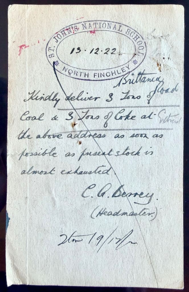 St John’s National School, North Finchley’s headmaster writes to Coal merchants…