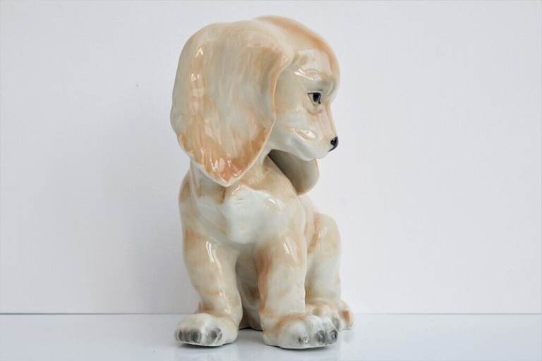 A beautiful and rare dog puppy figurine in porcelain by Arno Apel, Lauenstein, Bavaria, Germany, 1950's vintage. Full company name " Porzellanfabrik Keramika, Inh. Arno Apel" 1954-1974.