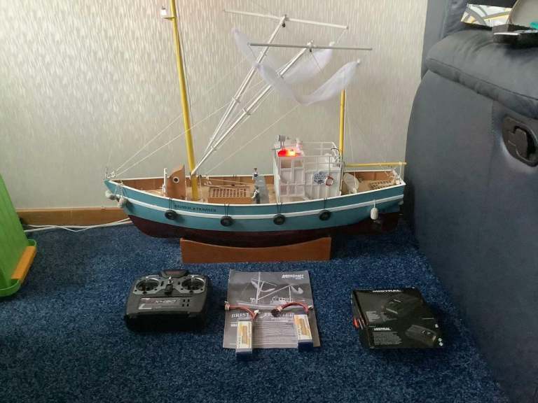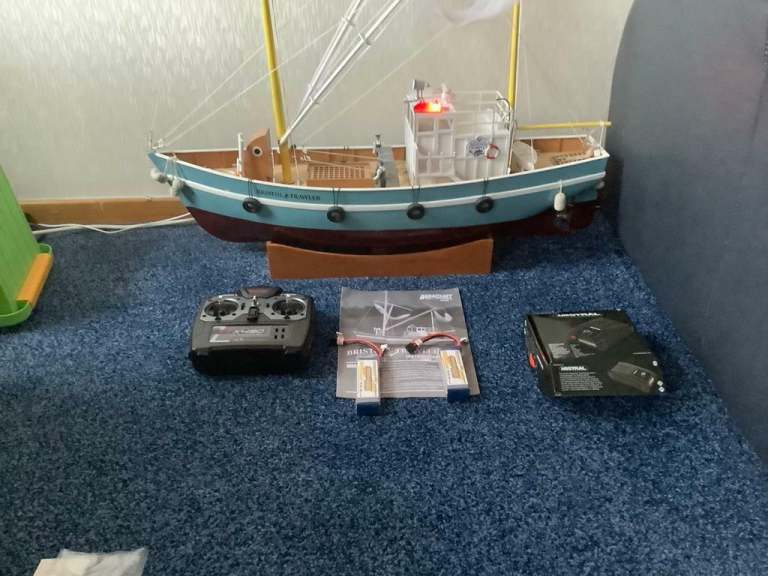 Bristol trawler fully remote interference free, 2 hipro batteries and charger,mast lights separate unit 2aaa batteries,netscan be position 3 ways can be fitted with motor remote already for this,spares also excellent condition,collection only,trawler 30 inches long 8wide ,with mast 22inches,collection only,Tested in water numerous time ,use on auto on remote.Re Advertising due to time waster.