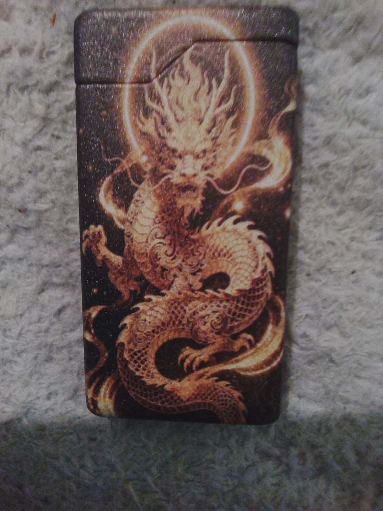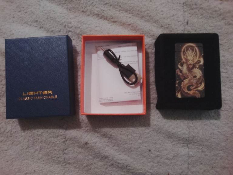 Very nice quality metal rechargeable windproof Arc lighter with USB charging cable no gas or Flint's required has dragon design on front comes with original packaging and charging cable highlighted power level and a double arc please see all pictures for condition and detail , brand new unused except for testing