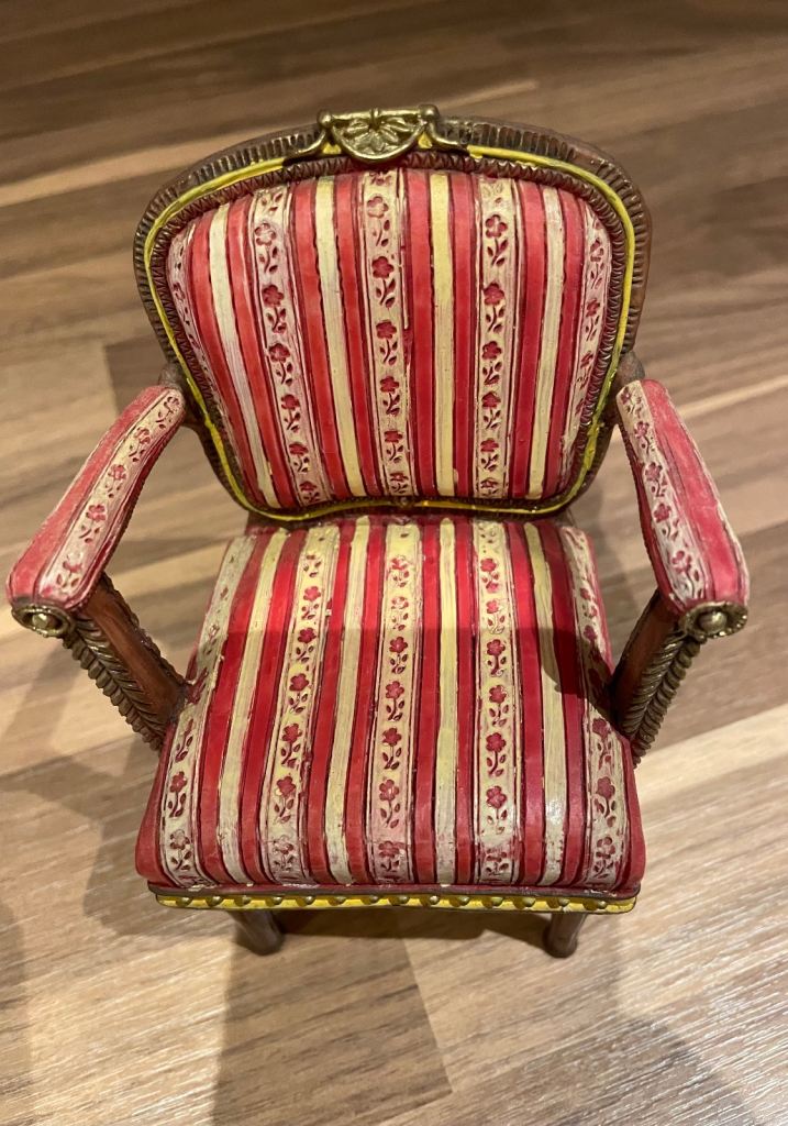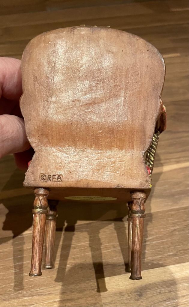 Perfect condition. Bear sits on a beautiful chair.
