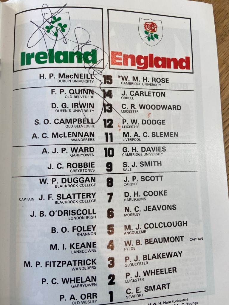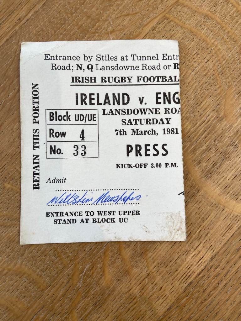 Rugby Programme Signed Autographed Ireland v England 7 Mar 1981 & Press Ticket Stub