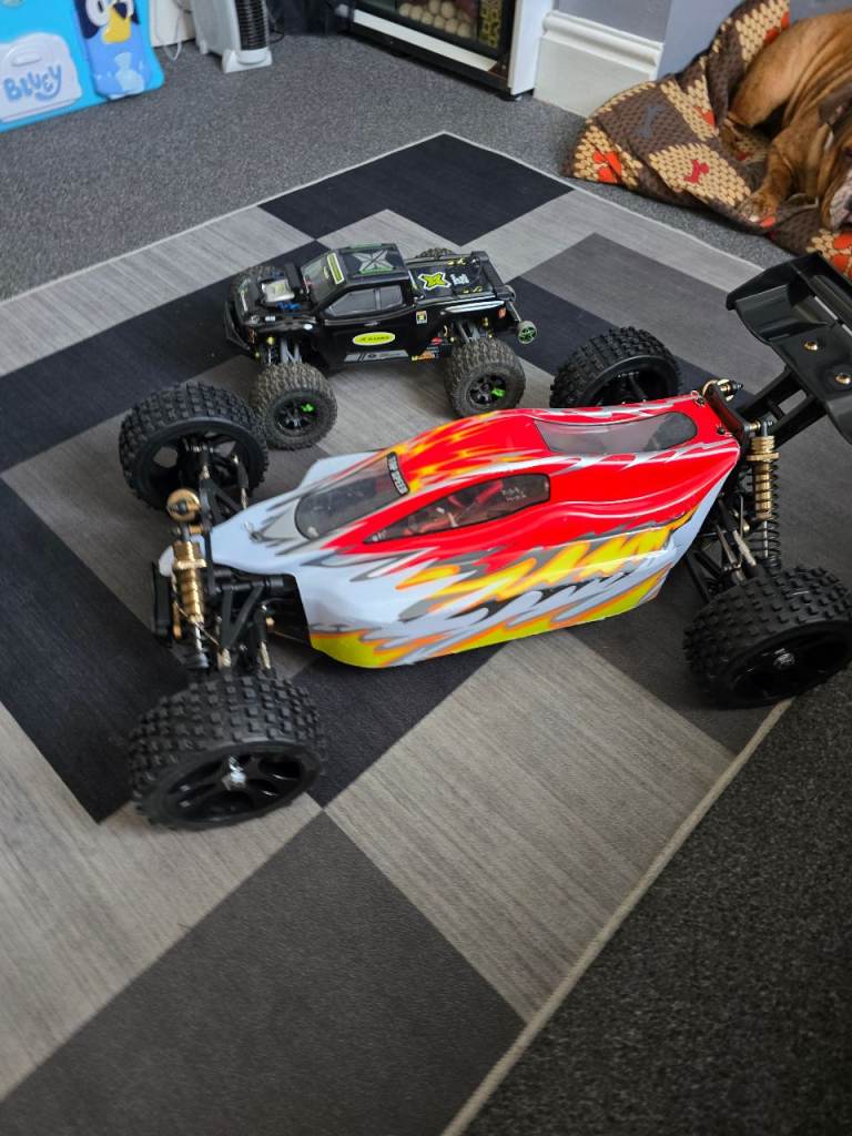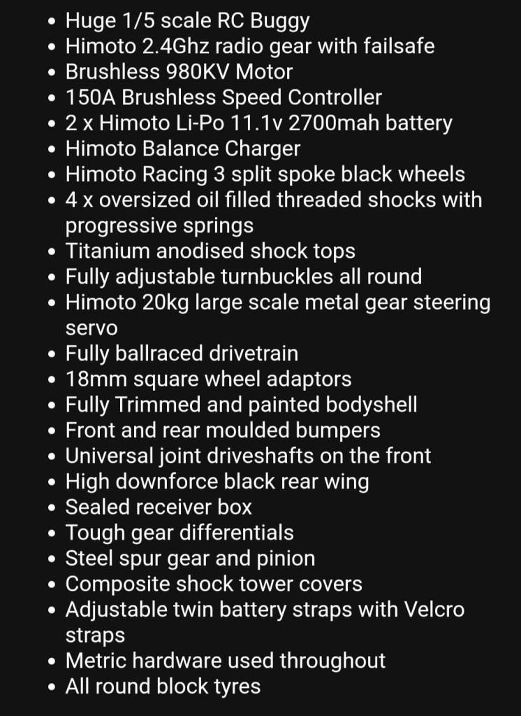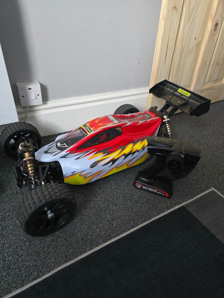 Selling my large 1/5 scale (6s) brushless rc buggy week old perfect working order to large to store in my house all info in the pics takes 2x 3s lipos (6s) has 6s esc and motor 150a powerful alot of torque pics dont do it justice collection is lowestoft can post if needed at buyers cost NO PAYPAL bank only price is £450 with out the lipos or £500 with the lipos will need to get your own charger not a toy 16+ can be seen working just give me cuple of hours befor hand to charge the lipos as theres 2 of them