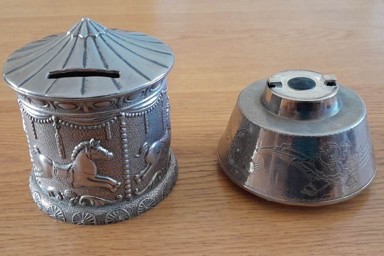 Vintage 1990s Silver Plated Carousel Money Box which can be used alone or attached to a Musical Box which makes it rotate. Lovely condition from a pet & smoke free home. Ideal Birth or Christening Gift