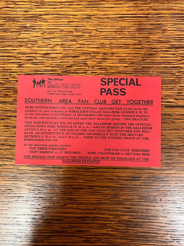 6) Special Pass for The Beatles Fan Club Southern Area Get Together - Wimbledon Palais Ballroom, London - Sat 14th Dec 1963