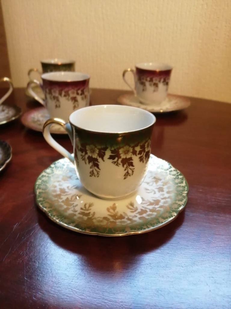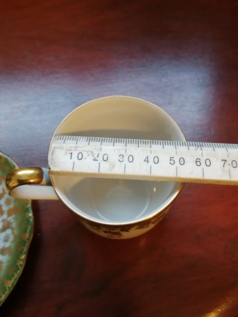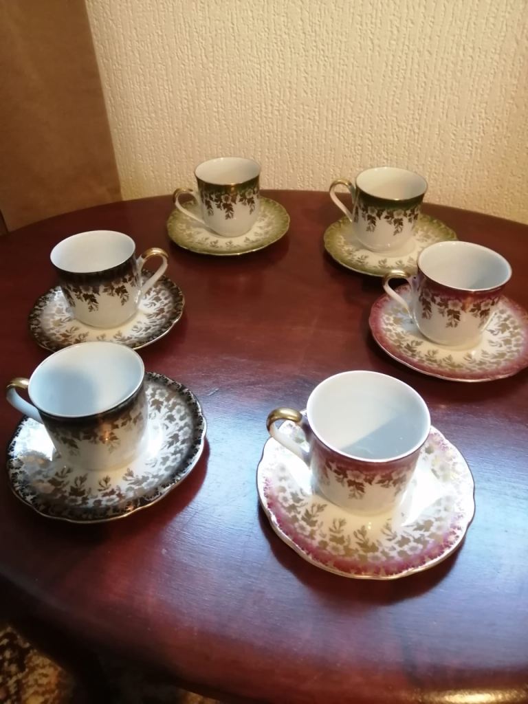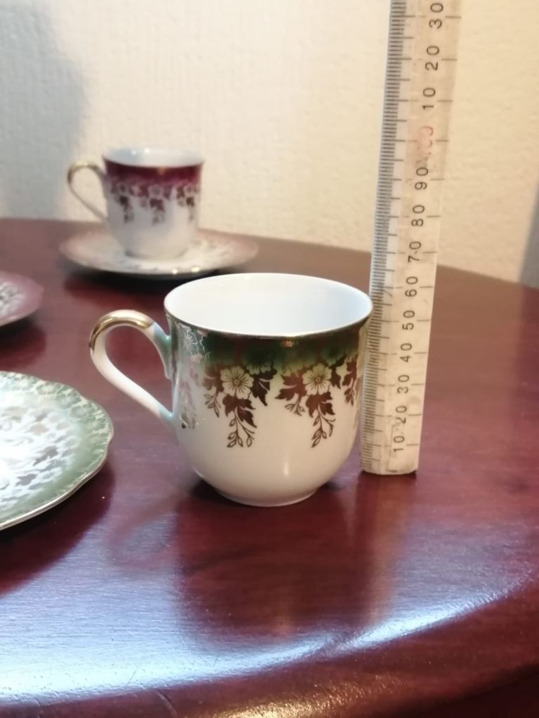 Tea set small size, 6 x cups with saucers, saucers stamped foreign 28 , cups stamped foreign 14. Size approx 55mm ht x 55 wd cups, 2 pairs red, green and black all in excellent condition
