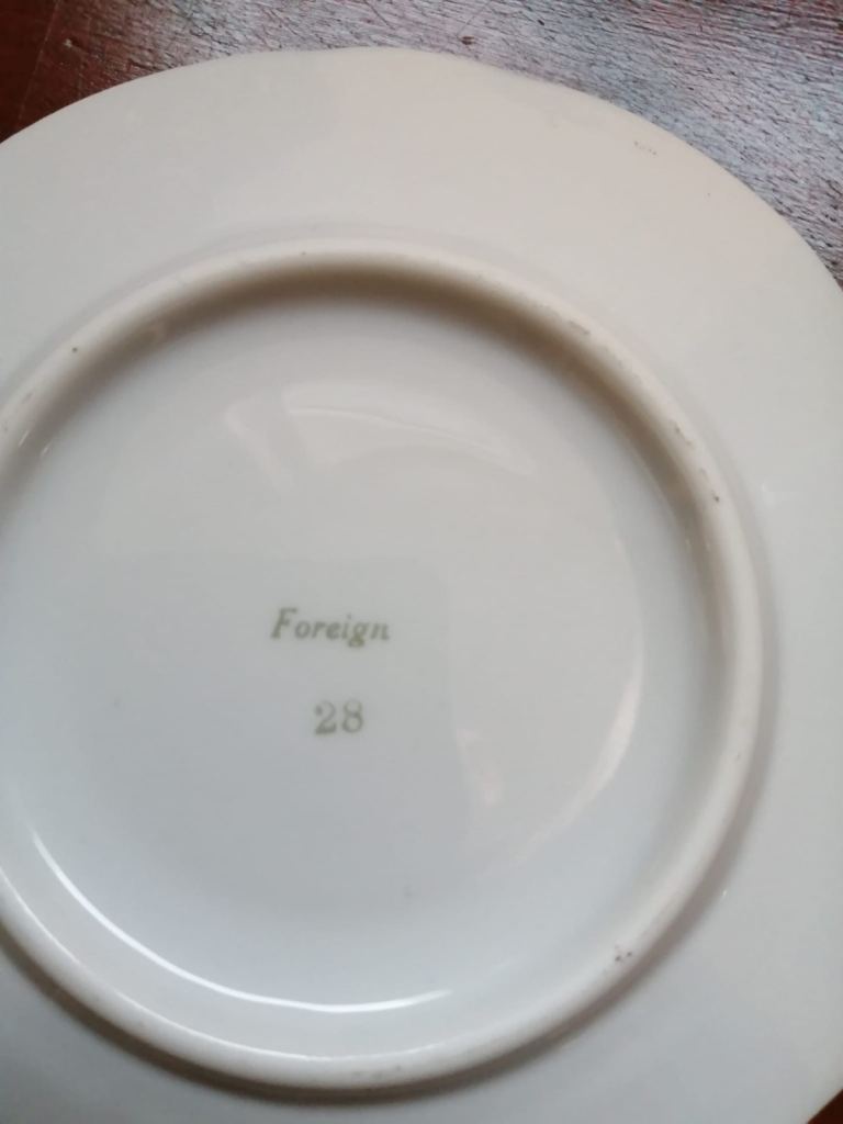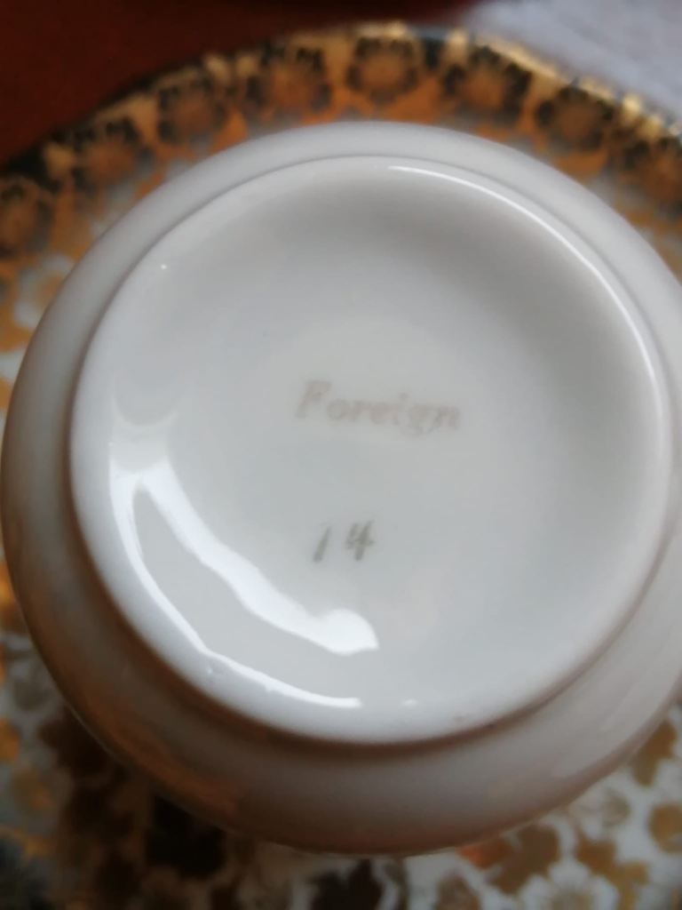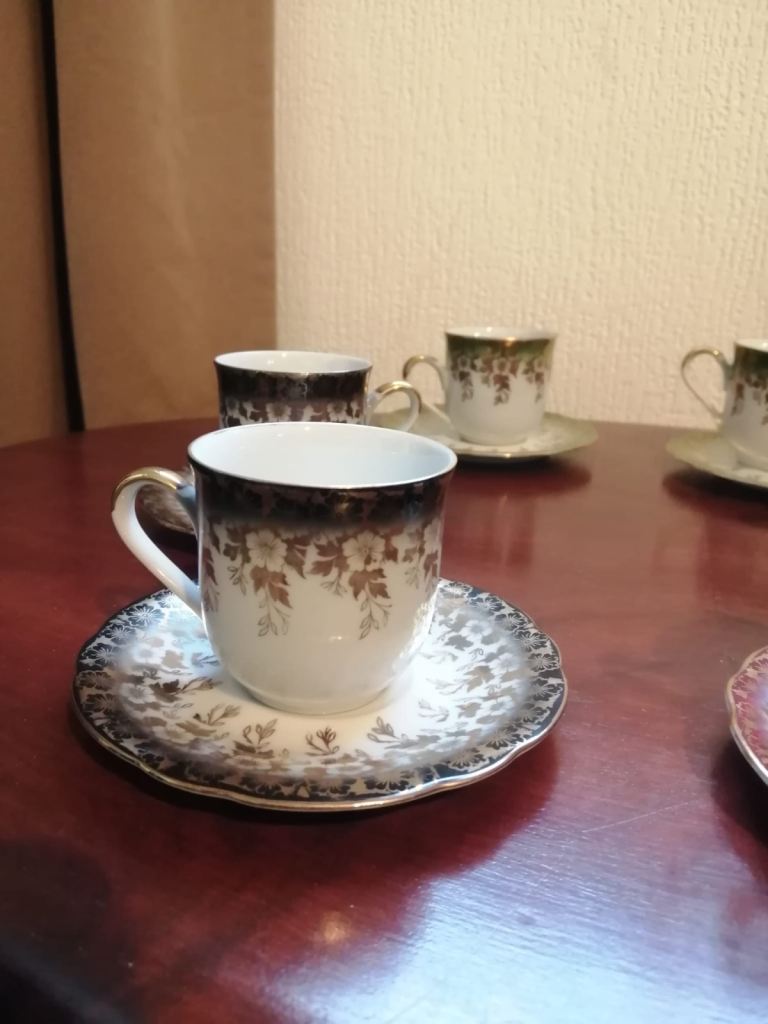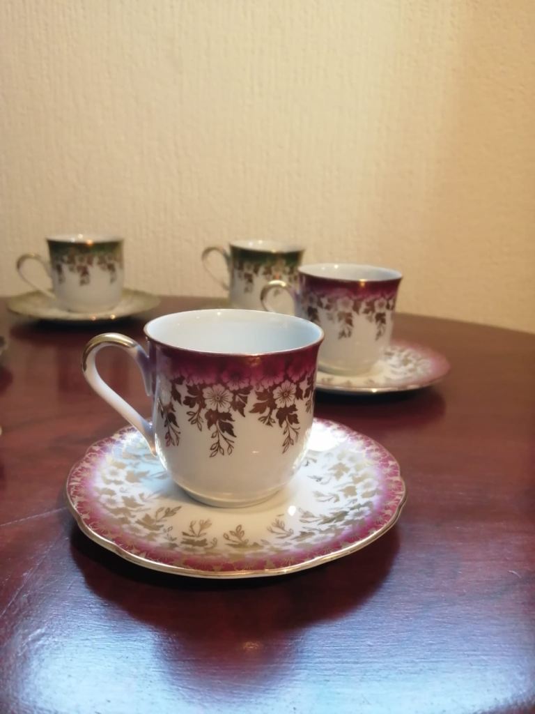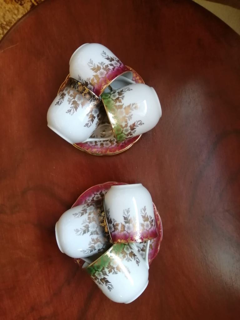 Tea set small size, 6 x cups with saucers, saucers stamped foreign 28 , cups stamped foreign 14. Size approx 55mm ht x 55 wd cups, 2 pairs red, green and black all in excellent condition