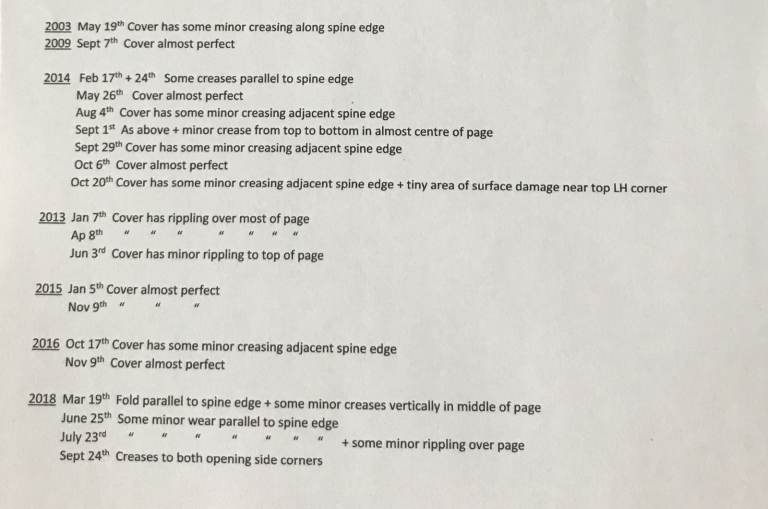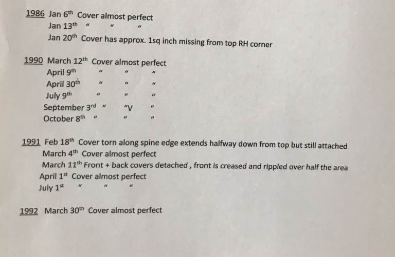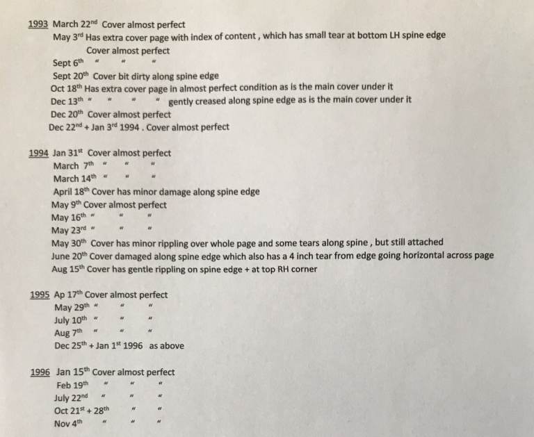 All are complete magazines although 3x issues have detached covers . 2x date from the 70s ( 1974 Mar 11 + 1976 Aug 30 ) . There are 32x issues from 1985 , 3x from 1986 , 6x from 1990 , 5x from 1991 , 1x from 1992 , 8x from 1993 , 10x from 1994 , 5x from 1995 , 5x from 1996 , 1x each from 2003 and 2009 , 3x from 2013 , 7x from 2014 , 2x from 2015 , 2x from 2016 , 4x from 2018 , 8x from 2019 , and 4x from 2020 . Approx 6x issues have covers in poor condition , and 60x issues have covers in almost perfect or very good condition . The remainder have covers with gentle rippling and/or minor creases . Please see the last 5x photos for detailed list and condition . Buy them all for £190 . Buy only the 60x issues in almost perfect or very good condition for £160 . I`m open to sensible offers on any number of issues ( will check their value on internet ) . Could post with extra costs of p+p added . Cost could be high as they are weighty . I would detach and send covers only if you require . If responding by phone please leave a message and I`ll get back to you . Please note there will be no more additions to this collection .