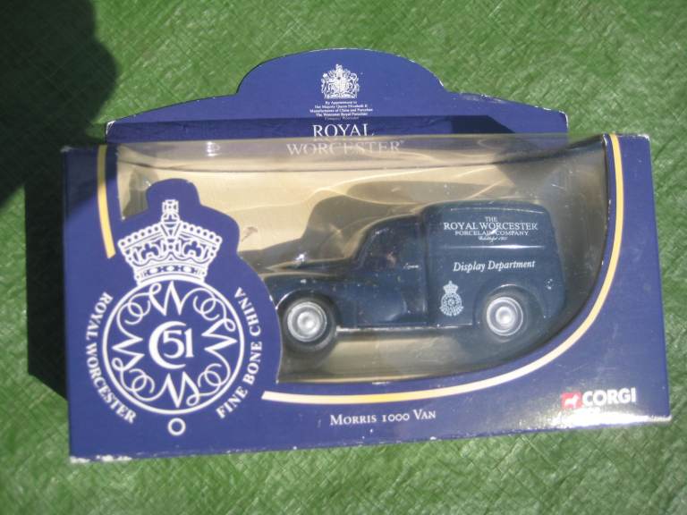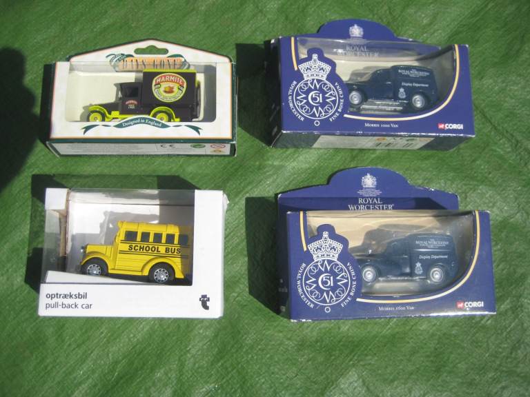 Two Royal Worcester Commemorative Morris 1000 Vans by Corgi - Number 67304; Zebra Yellow School Bus - pull-back car; all items sealed in their original boxes; Lledo Days Gone Marmite Van HAS BEEN SOLD