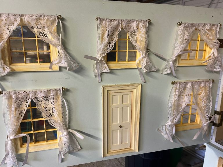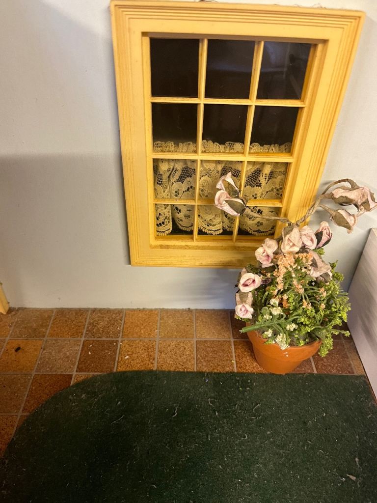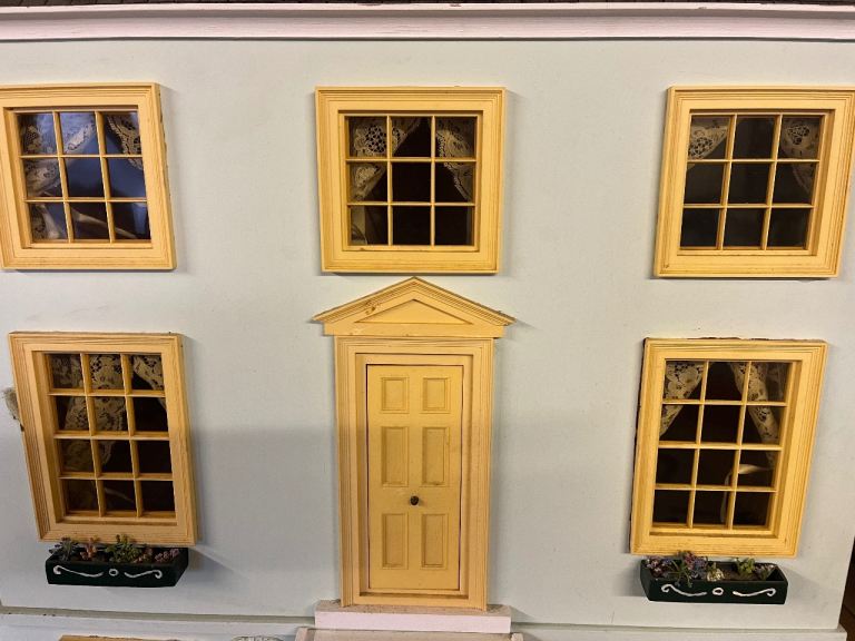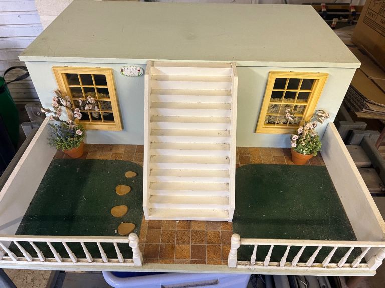 Victorian style dolls house, vintage, wooden, three storey, front garden with picket fence, bottom storey can be removed from the other two (see photos), decorated rooms (see photos)