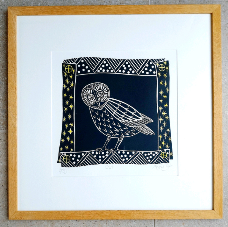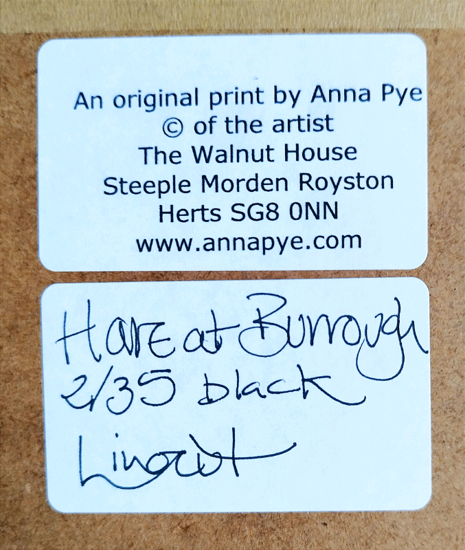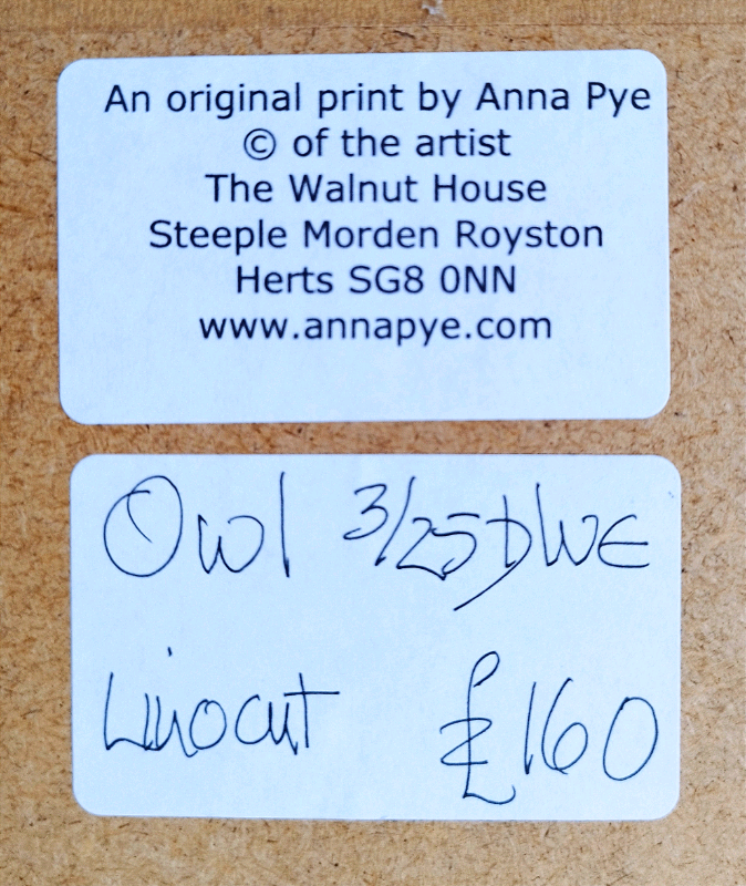 Two limited edition (print runs of 35 each) linocut prints in black ink, the Owl with yellow detailing. By Cambridgeshire print maker Anna Pye. Originally £300 for the pair from the artist's studio. The Owl is 30 x 30 cm and the Hare at Burrough is 33 x 33 cm, both framed in solid beech. Will sell individually or as a pair. Open to reasonable offers.