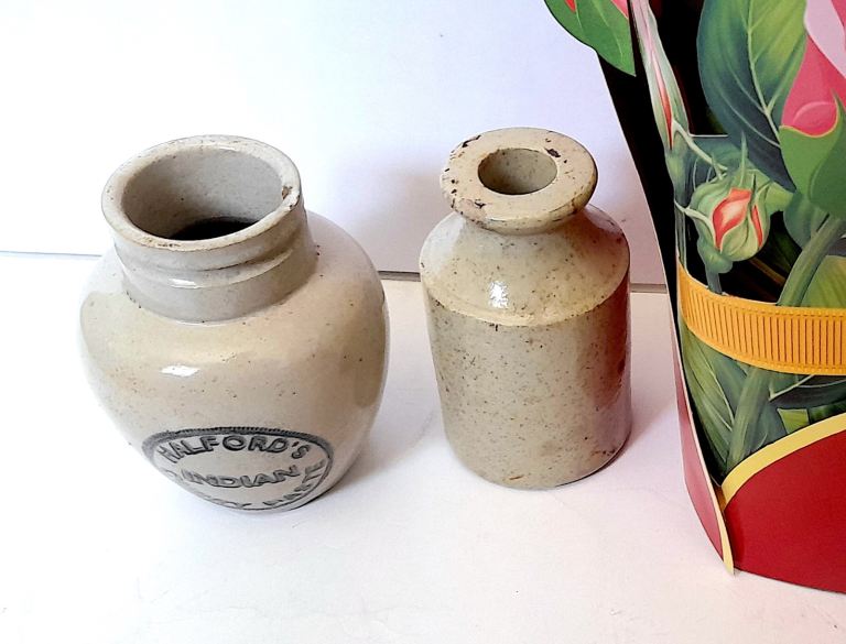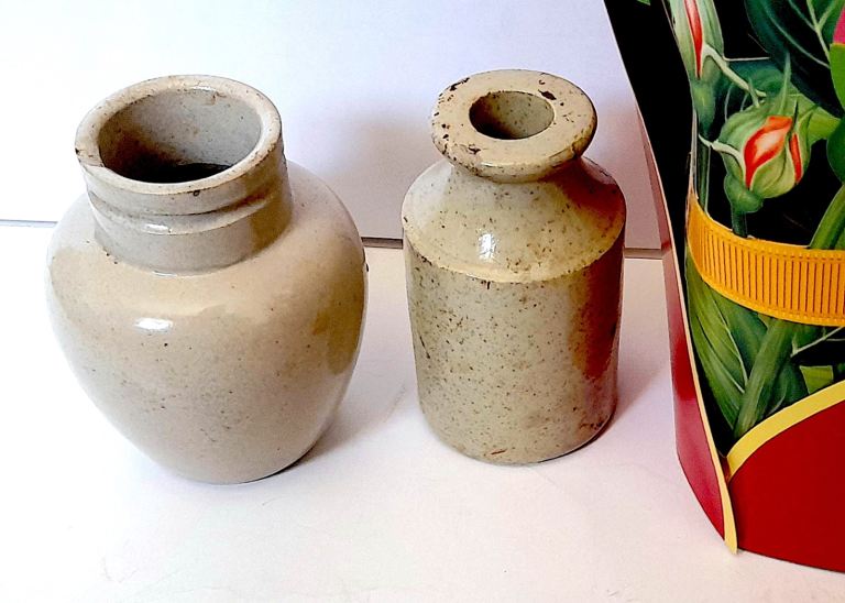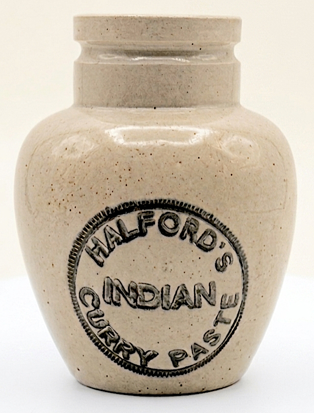 TWO x FAWN STONEWARE POTS - HALFORD's INDIAN CURRY PASTE and ANOTHER - 9 and 8 cm GOOD
