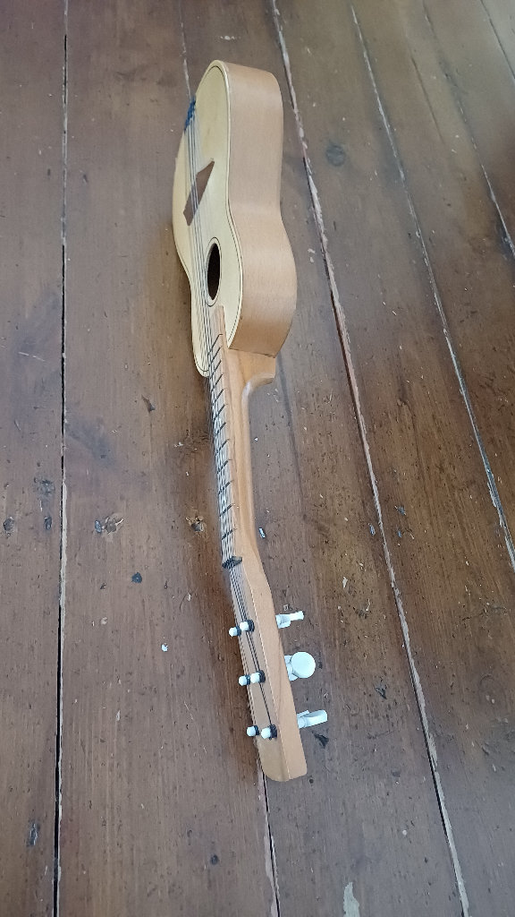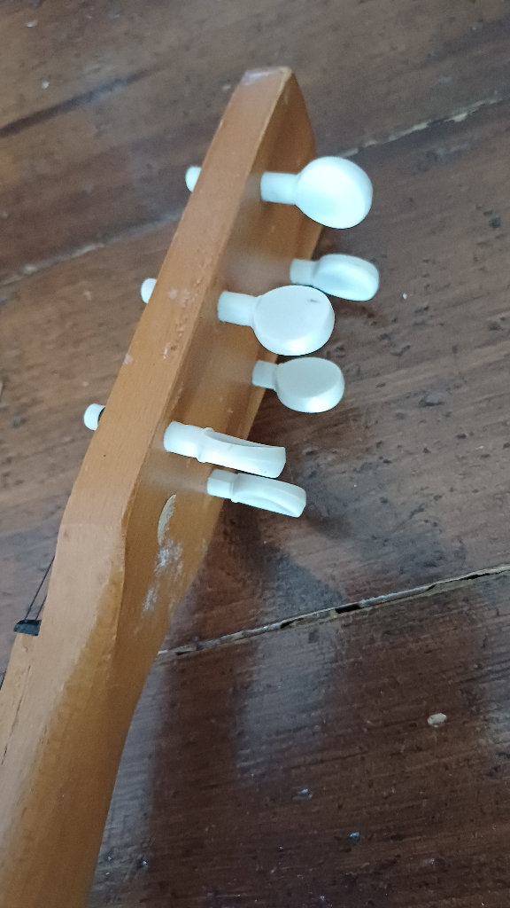 Kids wooden ukulele, good condition. Height 55cm. Width 18cm. Adjustable strings for tuning.