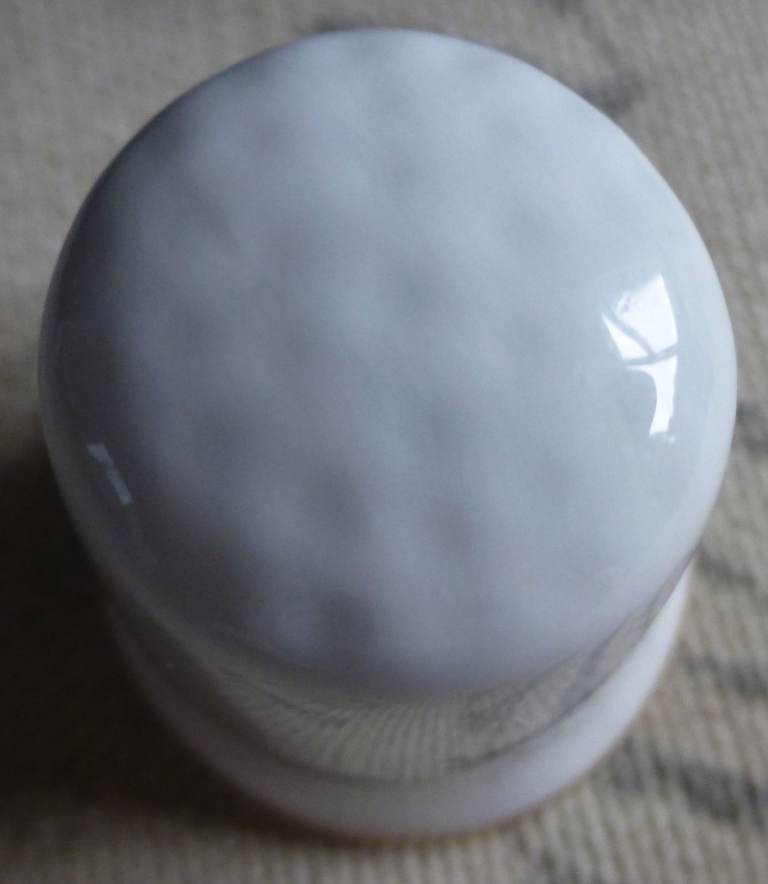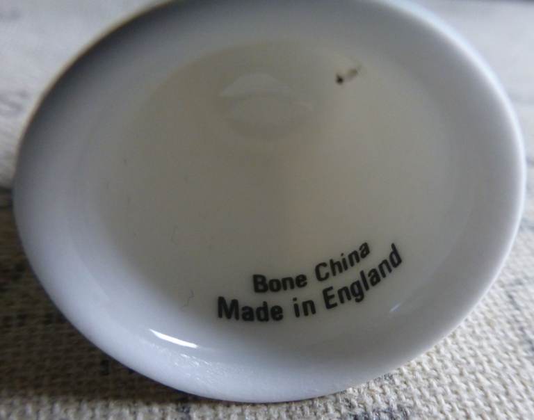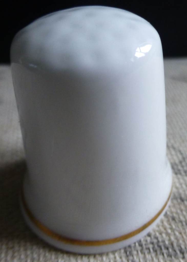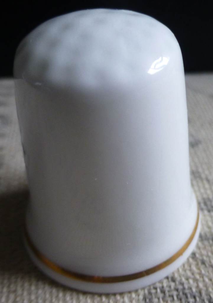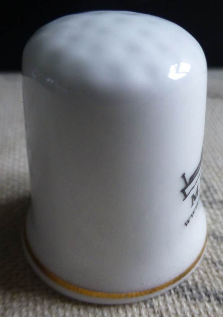 A white bone china thimble with a gold coloured band around the bottom. The image is black outlines; there is text and the website for Ullswater Steamers