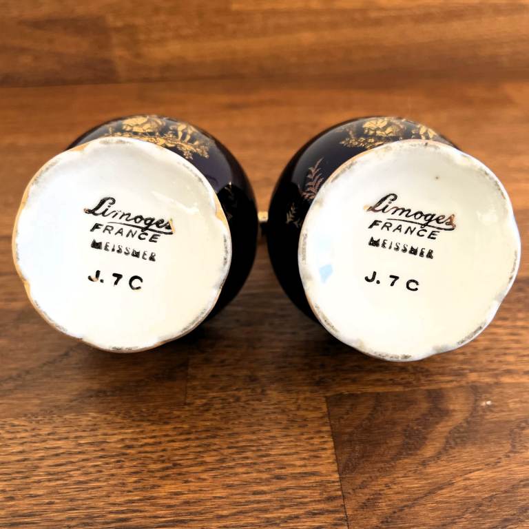 Vintage 1960's 2 Limoges France Meissner J.7 C jugs. Cobalt blue & gold, courting couple.