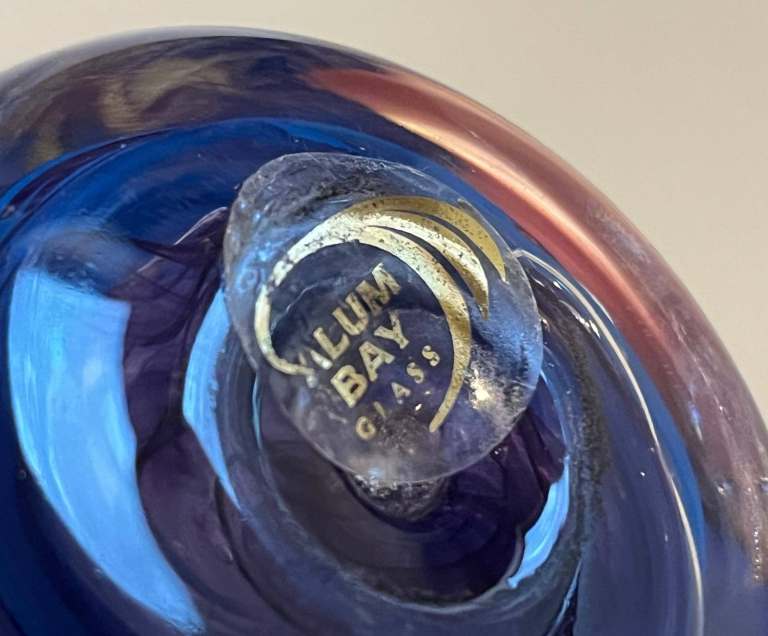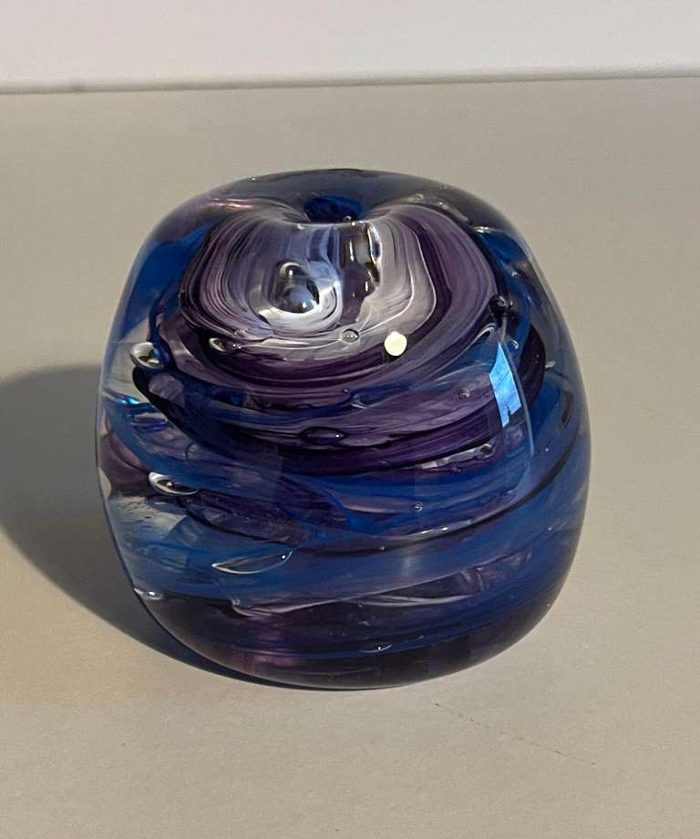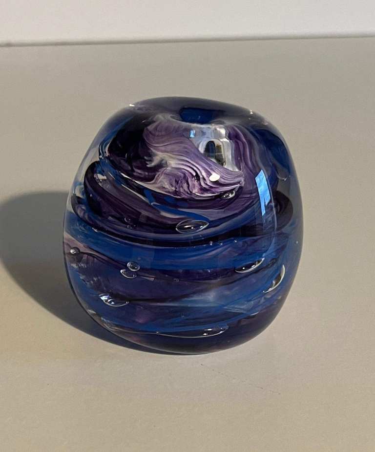 Vintage Alum Bay Mystical Glass paperweight ornament with a blue and purple swirl design.