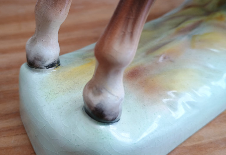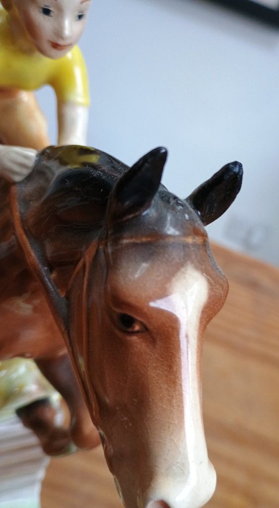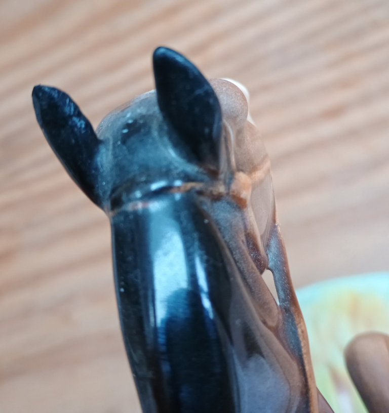Repairs to 2 areas - riders right boot and horses left ear, plus crack area horses rear right hoof.