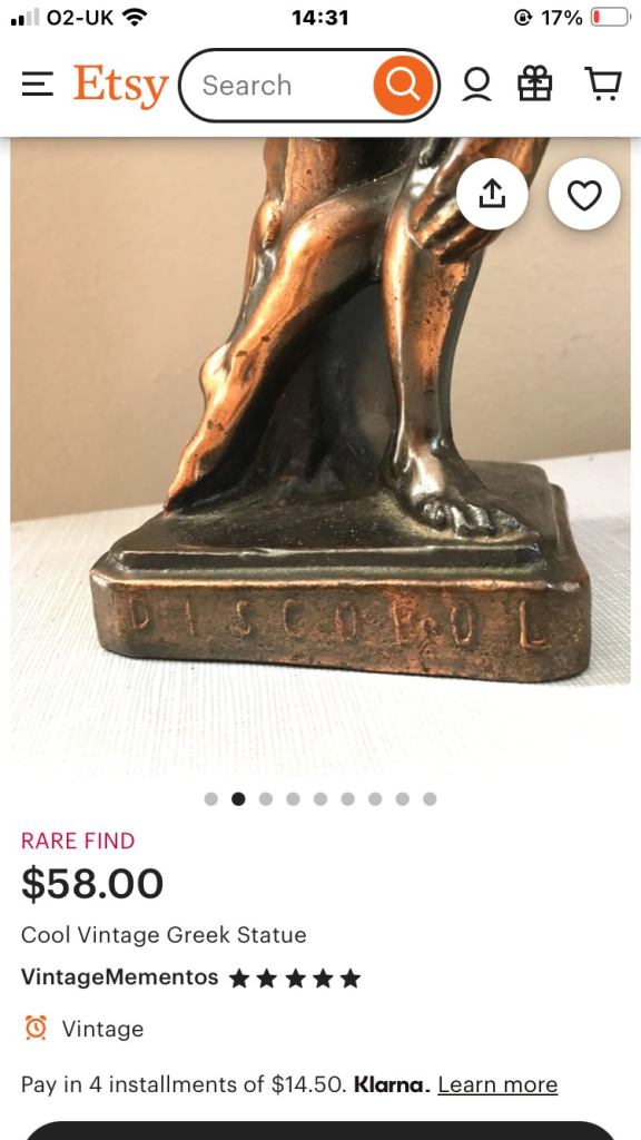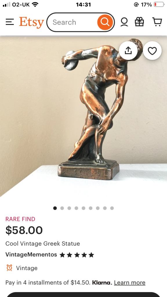 Vintage bronzed metal statue of a Greek Discobol discus thrower
