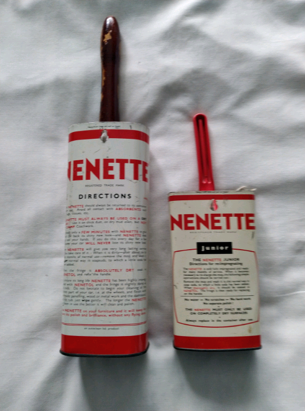 Two vintage Nenette car dusters in original tins, classic car accessories, 1950's, approx measurements of tins - one 9" with wooden handle, one 6" with red plastic handle. Sold as seen in vintage used condition. Collection from Basingstoke Hampshire RG22 area off Sullivan Road near Asda.