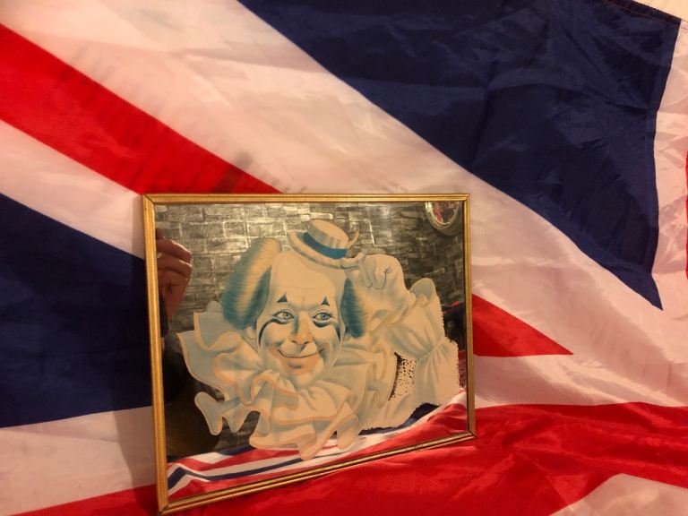 "Step right up and add a touch of vintage charm to your collection with this delightful Arthur Sarnoff 'Elmo the Clown' Mirrored Print. This classic piece of vintage wall art, also known as the Elmo the Clown Print or Arthur Sarnoff Clown Mirror, features a wonderfully detailed and smiling clown portrait with characteristic blue accents in the hair and a ruffled collar, set against a reflective mirrored background.