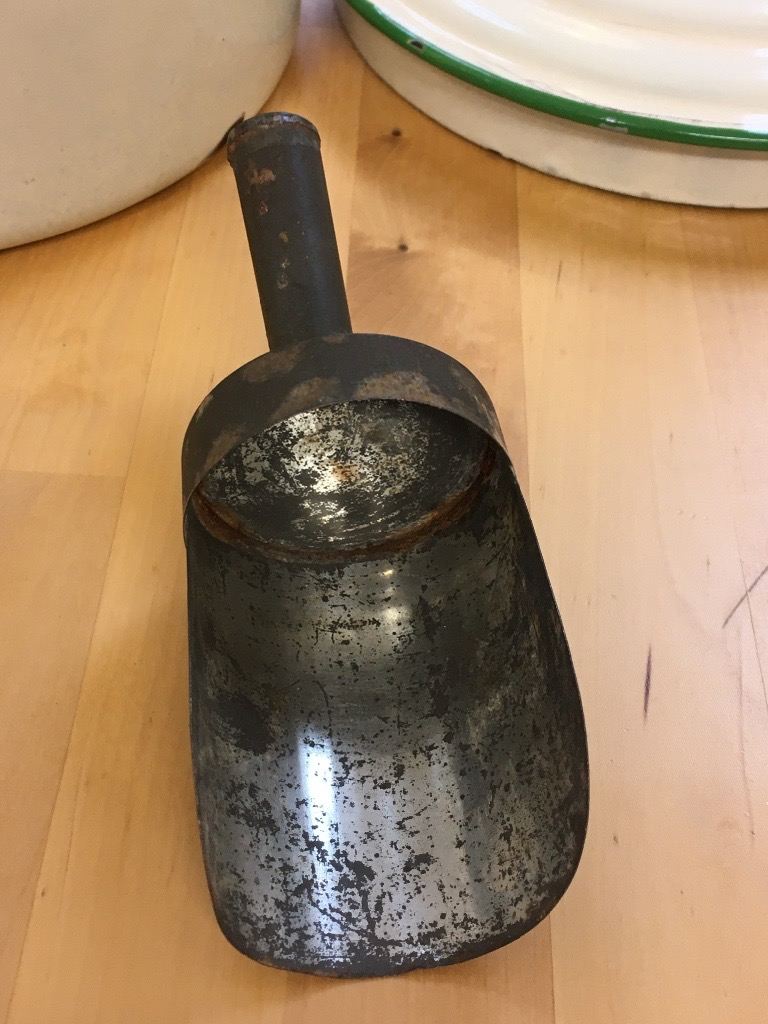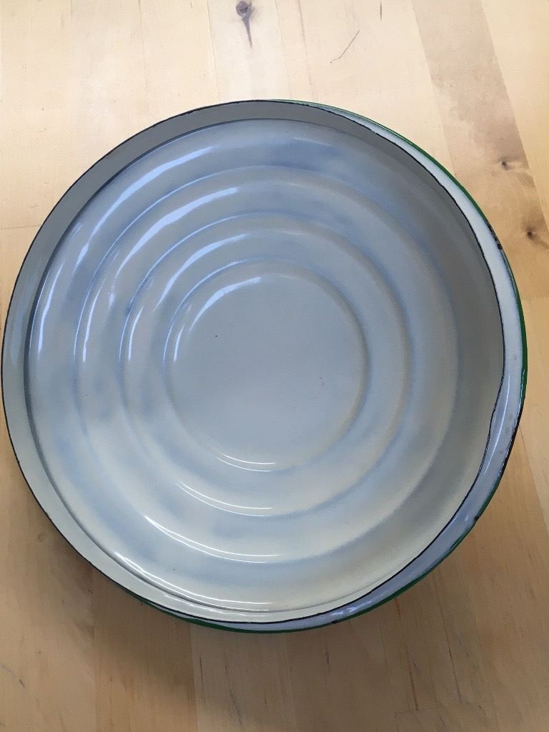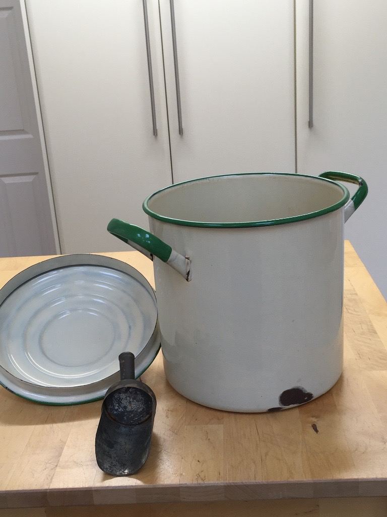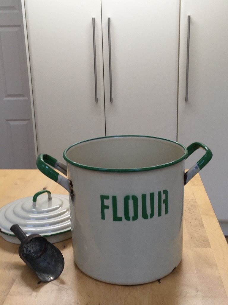 Vintage Cream and Green Enamel Flour Bin/Storage/Container with Flour Scoop/Spoon/Shovel. Hight 9 inches to rim 11 to top of handle. 9 inch diameter width 13 inches handle to handle. Collection only.