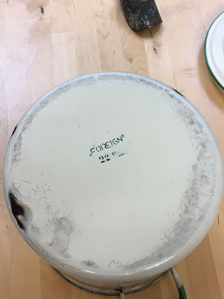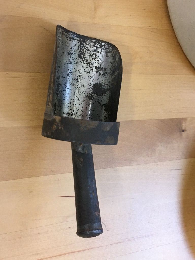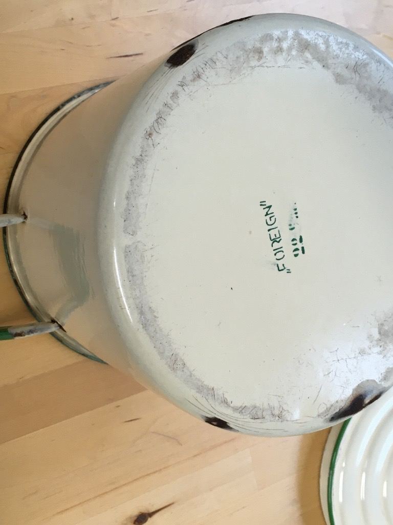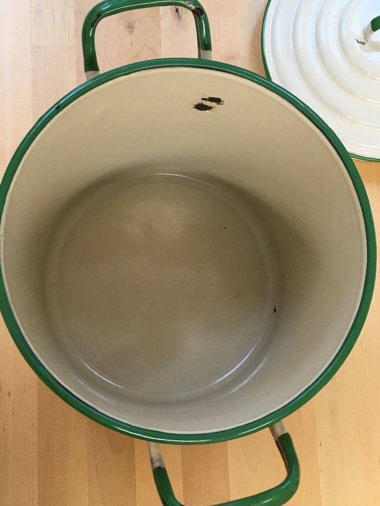 Vintage Cream and Green Enamel Flour Bin/Storage/Container with Flour Scoop/Spoon/Shovel. Hight 9 inches to rim 11 to top of handle. 9 inch diameter width 13 inches handle to handle. Collection only.