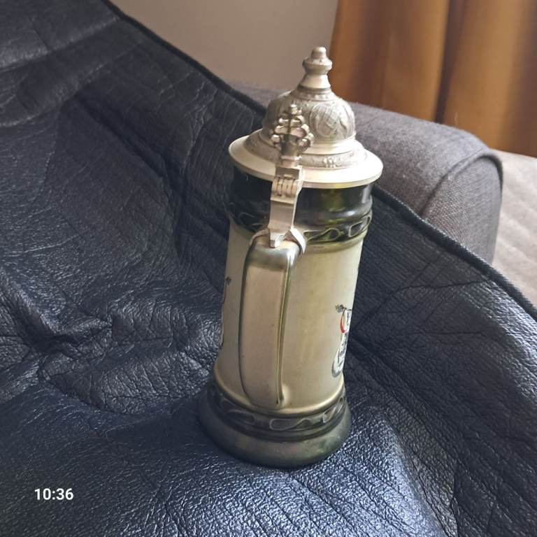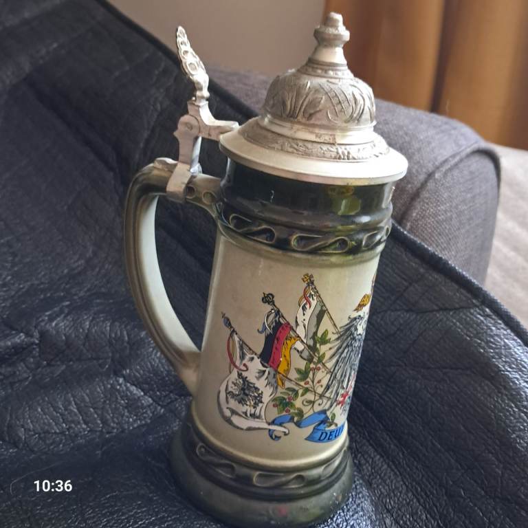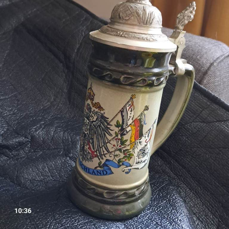 VINTAGE GERMAN HAND PAINTED BEER STEIN GLAZED CLAY WITH PEWETER LID 10 " TALL