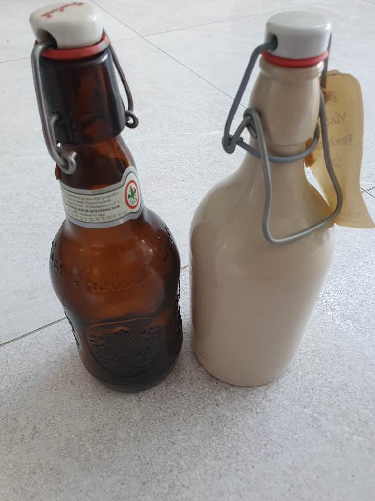 Vintage Grolsch stone cap beer bottle from 1990 and stoneware bottle with similar top.