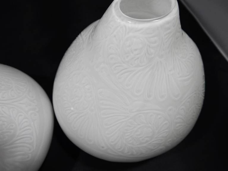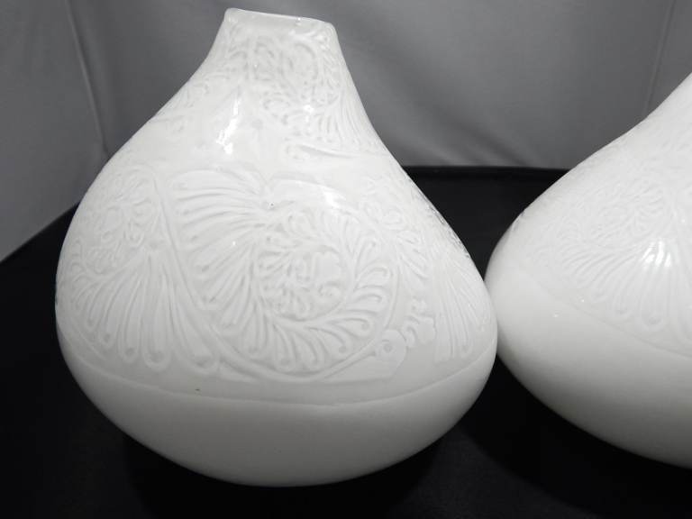Vintage Pair of Opaque White Glass Vases Etched Decorations