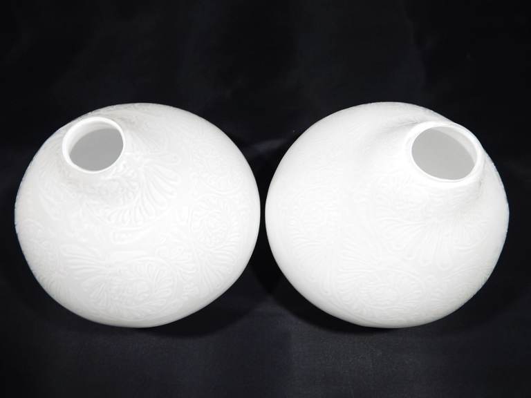 Lovely pair of vintage hand blown studio white opaque glass vases with etched scrolling foliate decorations, and in asymmetrical shape. In very good condition, no chips or cracks. No maker's marks.
