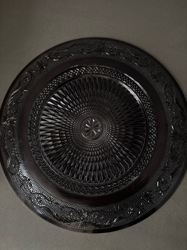 A beautiful vintage unusual plate that is in perfect condition and decorated on both sides with intricate patterns. A silver colour on the top but slightly more bronze coloured on the bottom.