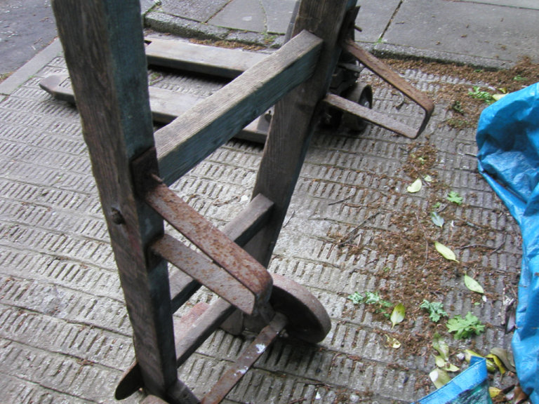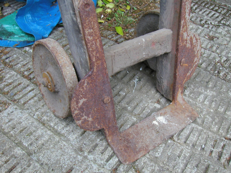 Here we have a vintage wooden sack barrow with solid iron wheels no rot or worm just a bit of age related wear and surface rust would look great cleaned up.