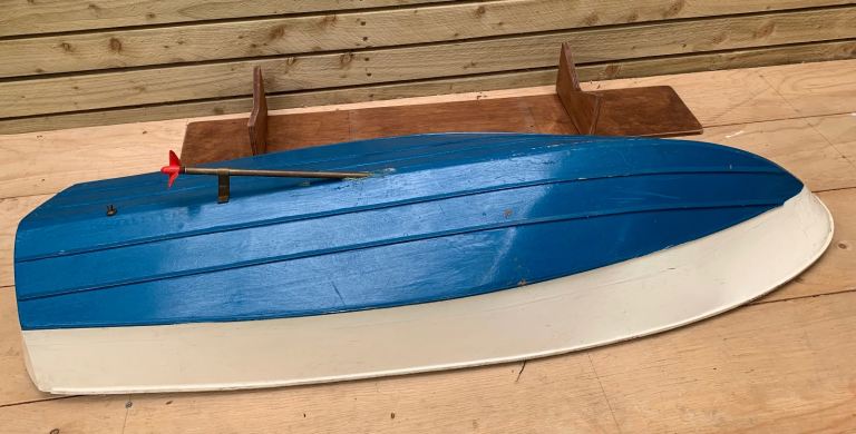Vintage Scratch Built Model Pond Yacht Motor Boat Cruiser on Stand 1960s 70s